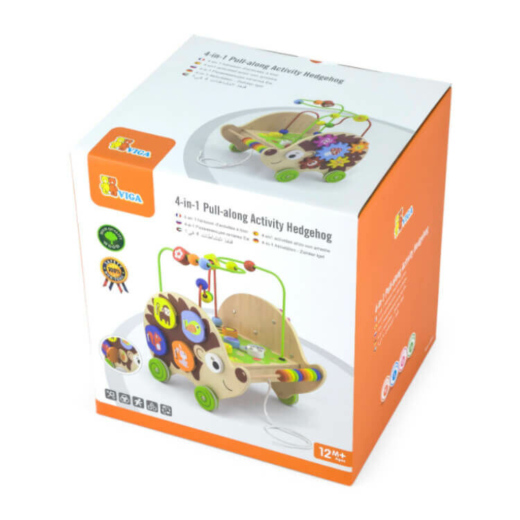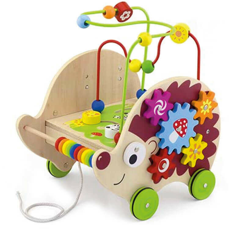 Egy készségfejlesztőjáték, mely megannyi foglalkozási lehetőséget rejt magában. Nagyon hívogató már a legkisebbek számára is, hiszen vidám színekben pompázik minden eleme. Hosszú időre leköti a kisgyermekek figyelmét, mivel többféle módon lehet vele játszani. A süni ormányánál található színes gyöngyöket előszőr csak tologatják ide-oda a kicsik, később viszont már segít a színek, számok elsajátításában. A gurulós játék tetején két népszerű játék is található, az egyik a golyóvezető, a másik egy labirintus. Mindkettő kiváló módon fejleszti a finommotoros készséget A süni két oldala is nagyszerű játékokat rejt. Színes és mintás fogaskerekek az egyik, nyitogatós játék a másik oldalon. A játék során fejlődik a gyermek szem-kéz koordinációja, finommotorikus képessége, valamint segít a szókincs bővítésben is. Motorikus játék