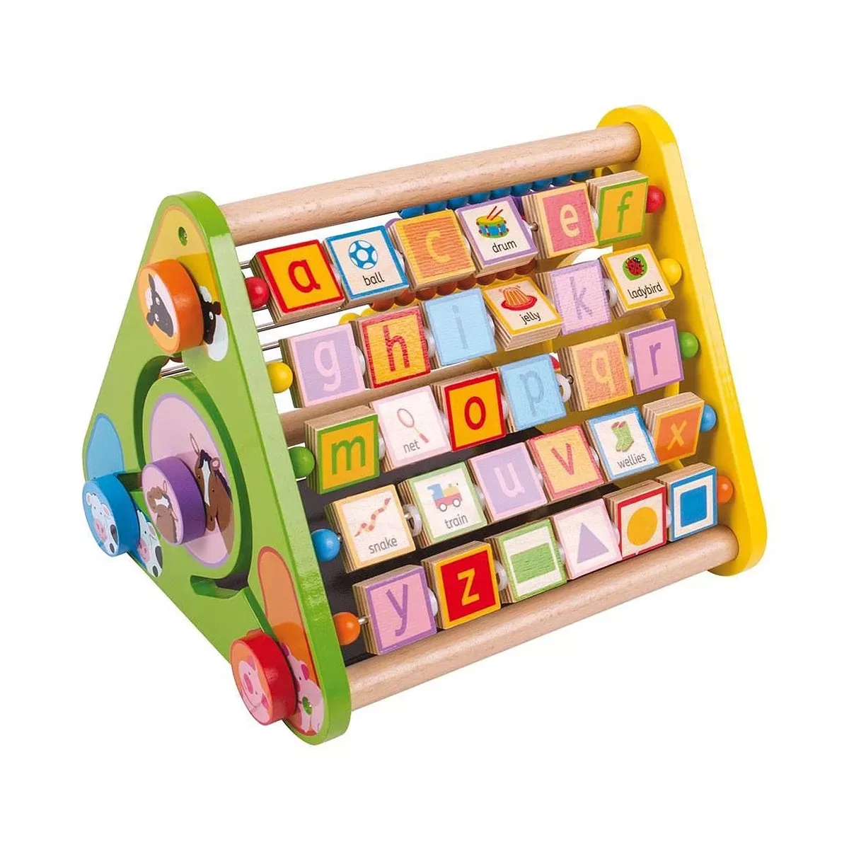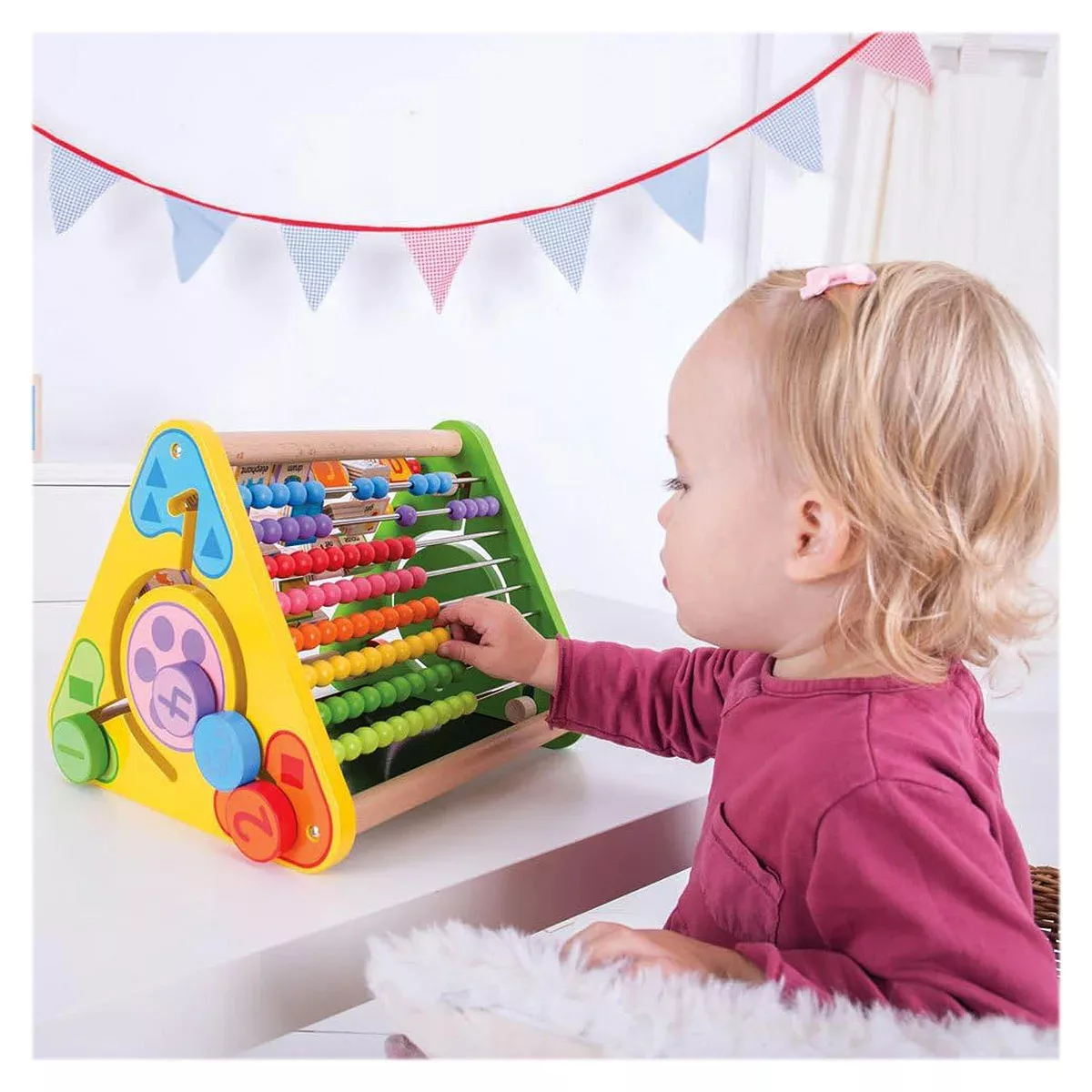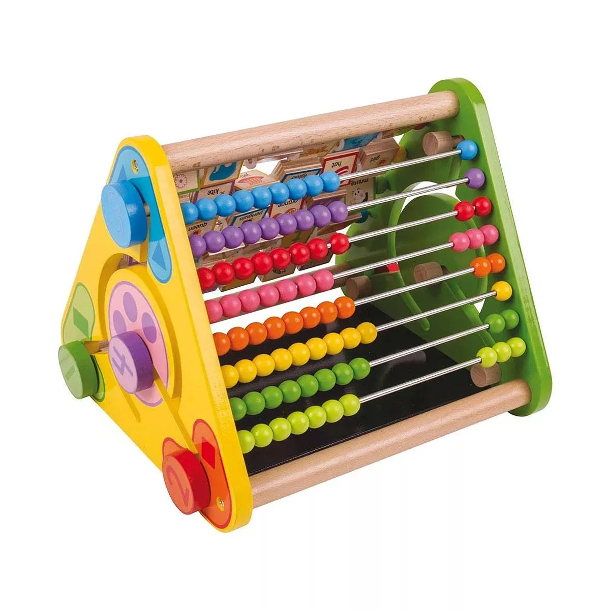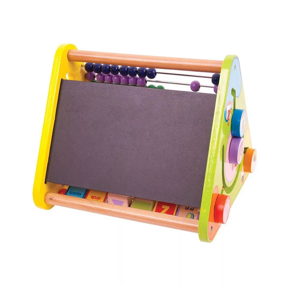 Az okosan megtervezett, háromszög alakú fa játék többféle mini-játékkal ösztönzi a kisgyermekek felfedezőkedvét és készségeinek fejlődését. Nincsenek levehető, apró alkatrészek, így biztonságosan játszhatnak 12 hónapos kortól – akár otthon, akár utazás közben.