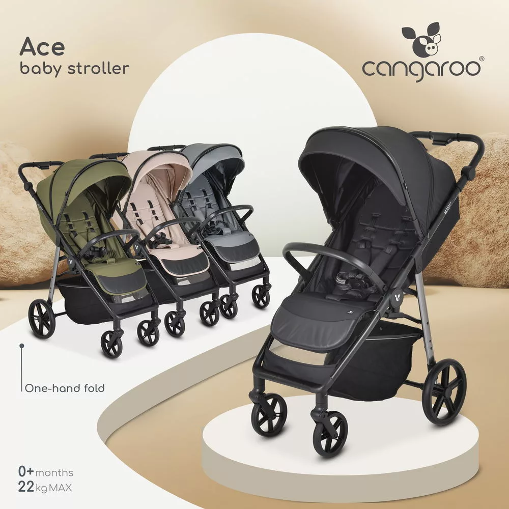 Könnyű, kompakt és könnyen összecsukható - az Ace babakocsi, a Cangaroo minden részletre odafigyelve készült, hogy maximális kényelmet biztosítson a gyermeknek és a szülőknek egyaránt. A kiváló minőségű gumiabroncsoknak és a teljes összkerékfelfüggesztésnek köszönhetően ez a babakocsi városi utcákon és terepen egyaránt használható, így bárhol sima és stabil utazást garantál.