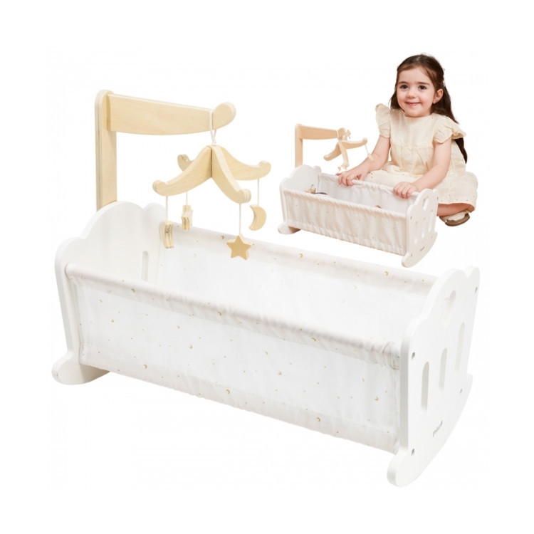 A bölcsőben puha pamutpárna és egy paplan található csillag- és holdnyomattal, valamint egy kiságy körhinta. Legfeljebb 38 cm magas babákhoz.
