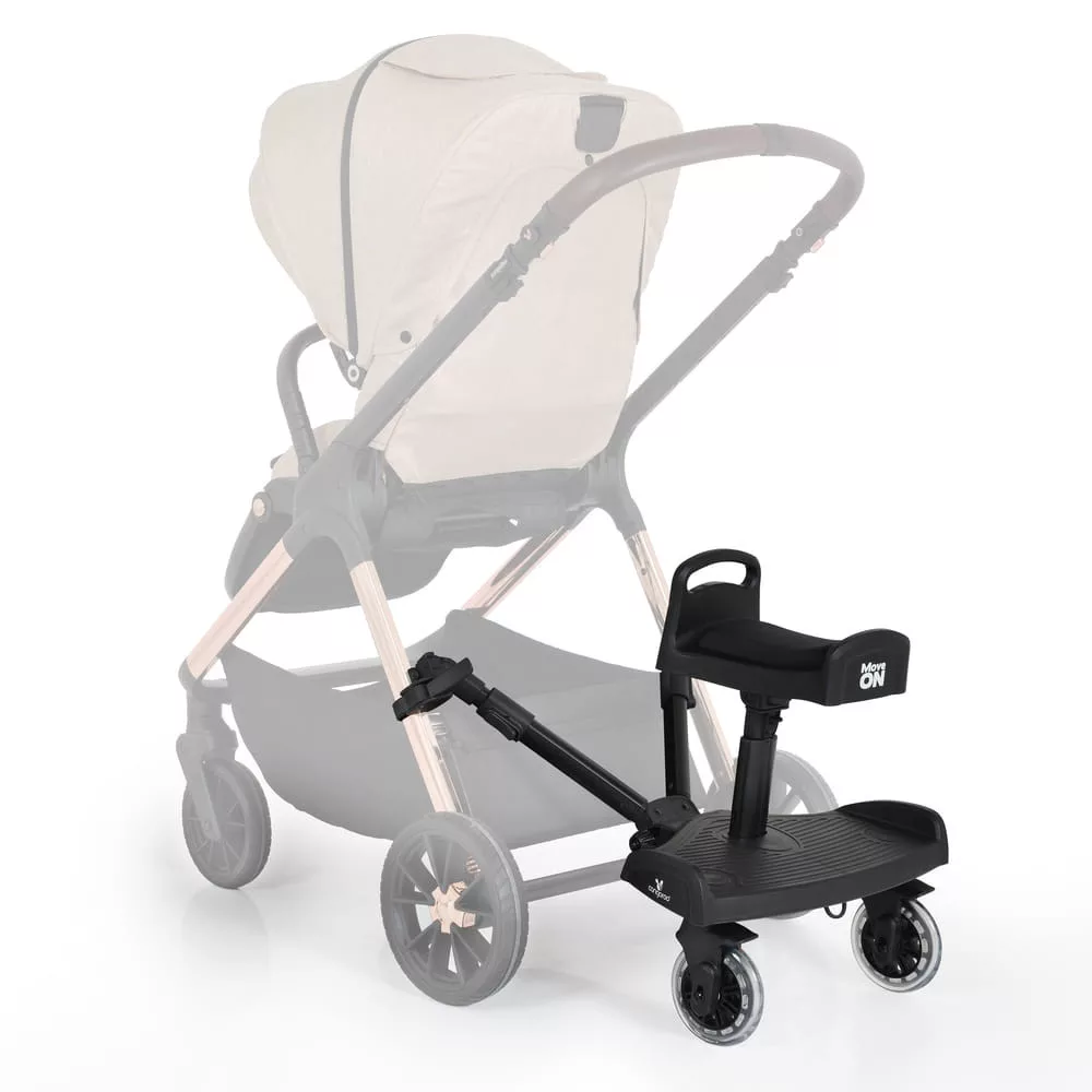 A MOVE ON Testvérfellépő ülőkével univerzális FEKETE egy elegáns és praktikus megoldás, ha két gyermekkel indulunk útnak. Az ülőkét könnyedén hozzá lehet csatolni a legtöbb babakocsihoz, így a nagyobbik gyermek is kényelmesen utazhat, miközben a kisebb testvére is elfér a babakocsiban. A szabadon forgó kerekek gondoskodnak a könnyű manőverezhetőségről és stabil irányításról. Az ülőke fekete színben pompázik, ami elegáns és időtálló megjelenést kölcsönöz neki. Egy igazán hasznos kiegészítő, mely megkönnyíti a mindennapokat, ha egyszerre több gyermekkel kell közlekedni.90 fokkal elforgatható, 3 magassági pozícióval rendelkező platform üléssel. A termék 15 hónaposnál idősebb, legfeljebb 20 kg súlyú gyermekek számára alkalmas.