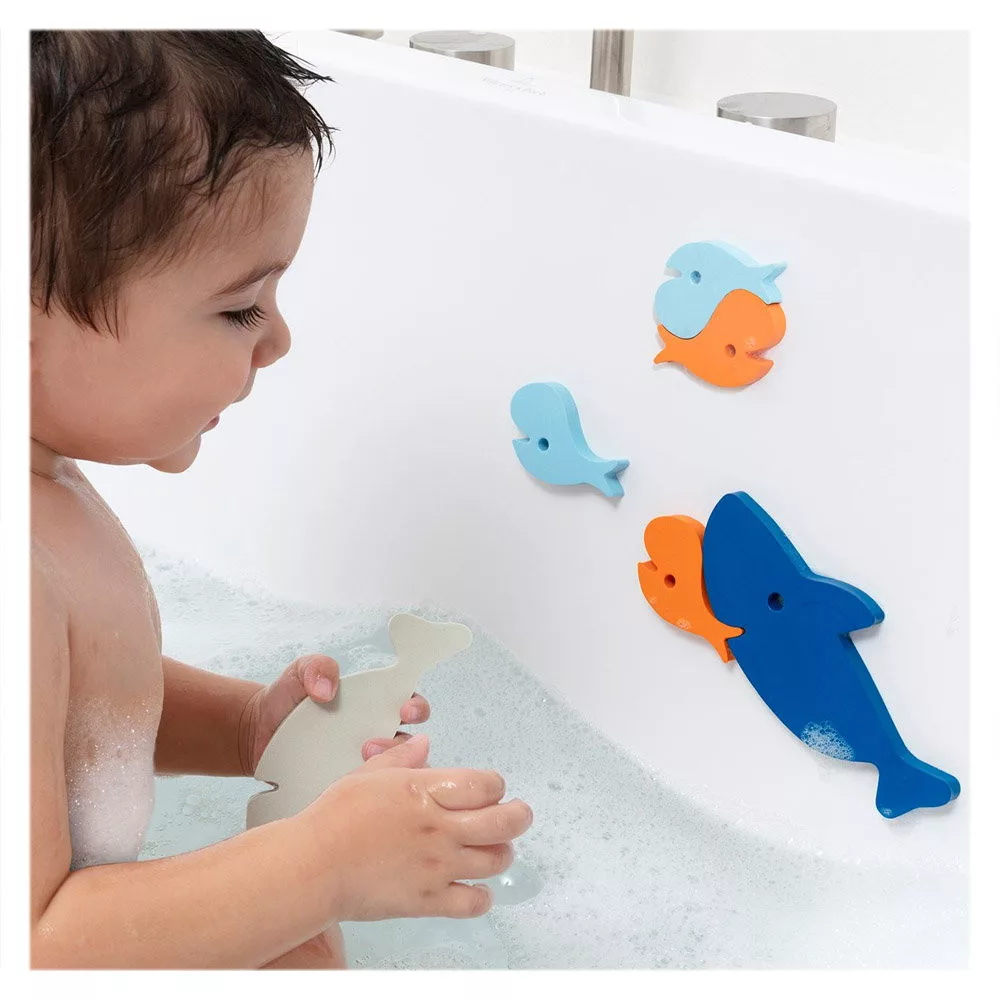 • A gyerekek fejlesztik finommotoros képességeiket azáltal, hogy a cápákat és halakat a kád oldalára ragasztják, vagy míg a színeket párosítják.