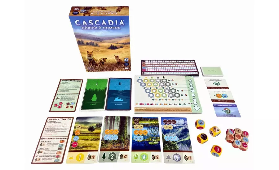 A Cascadia – Gördülő dombok az Év játéka díjas Cascadia vadvilága „válassz és írj” változata. A játékosok változatos élővilágot igyekeznek létrehozni a saját lapjukon a megfelelő kockák felhasználásával.