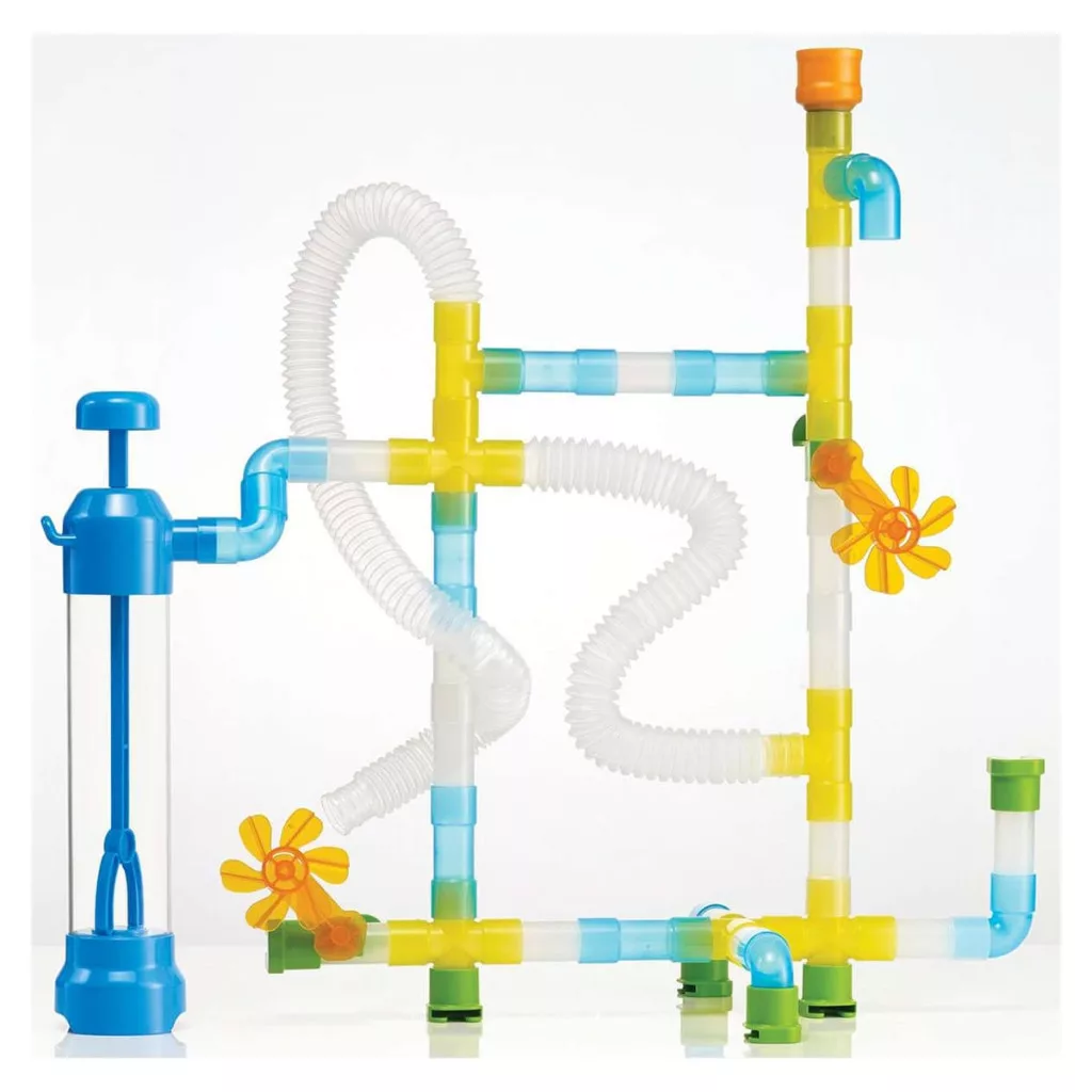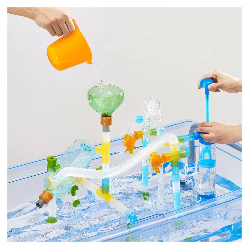 • A készlet 73 darabot tartalmaz, köztük 2 cm átmérőjű átlátszó csöveket, hajlékony csatlakozókat, forgó légcsavarokat, amelyek reagálnak a víz vagy levegő áramlására, rugalmas tömlőket és speciális kézi vízipumpát.