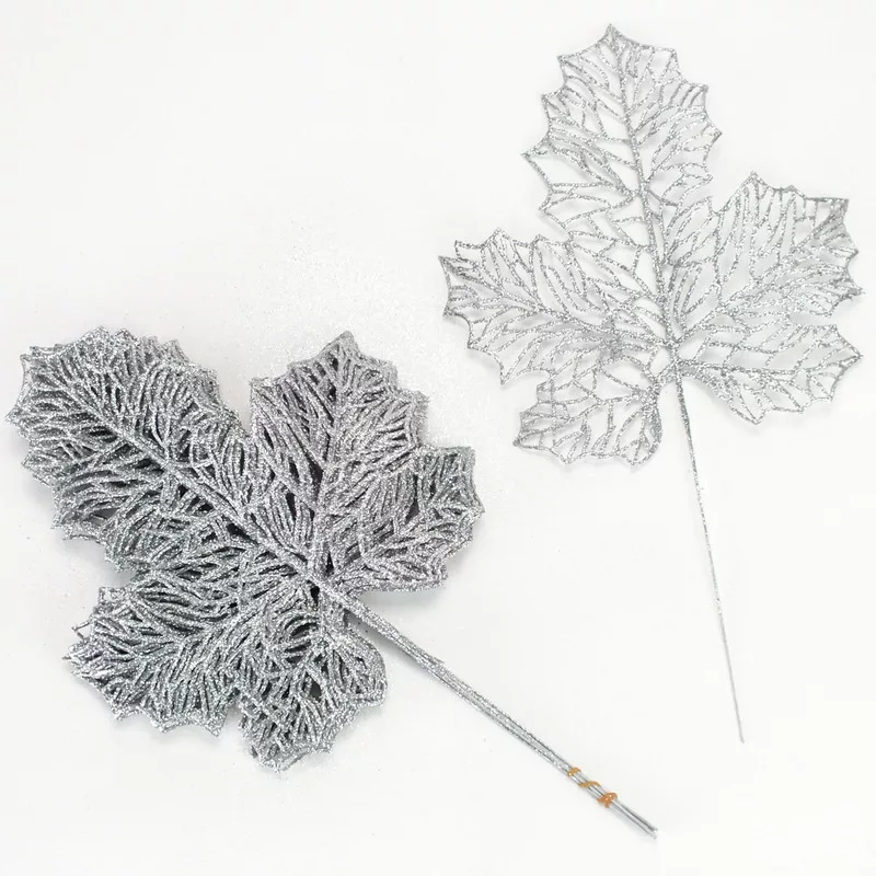 Ezüst színű juharfa dekorlevél: otthoni vagy kirakati díszítéshez. Önmagában vagy kiegészítő díszítéshez, készítményekhez egyaránt használható.