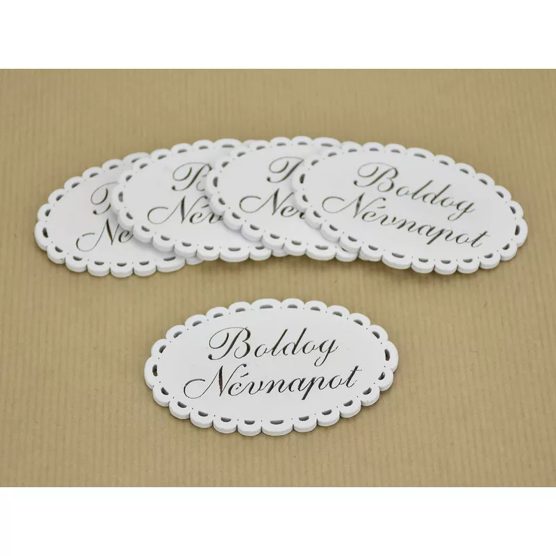 Fa - "Boldog Névnapot" csipkés ovál tábla fehér 5x8cm 5db/csomag