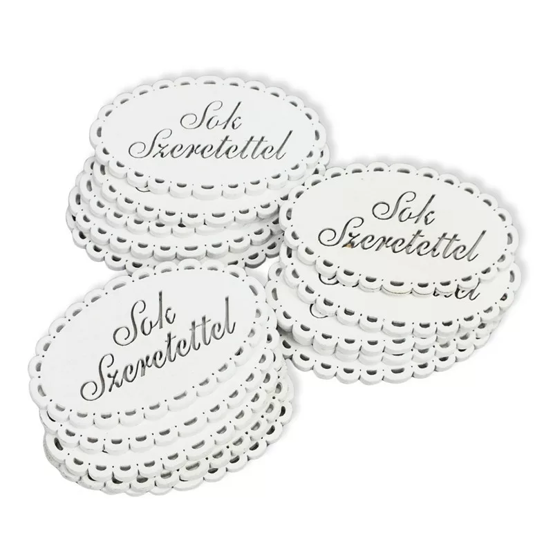 Fa - "Sok szeretettel" csipkés ovál tábla fehér 5x8cm 5db/csomag