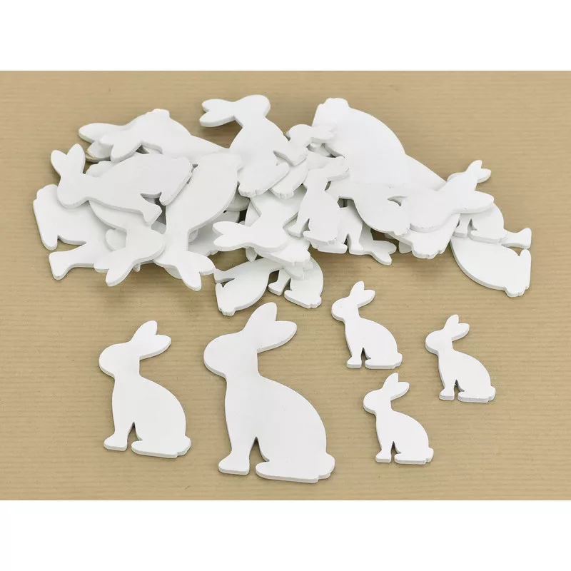 Fehér színű nyulak, vegyes méretekben húsvéti dekoráció megalkotásához.