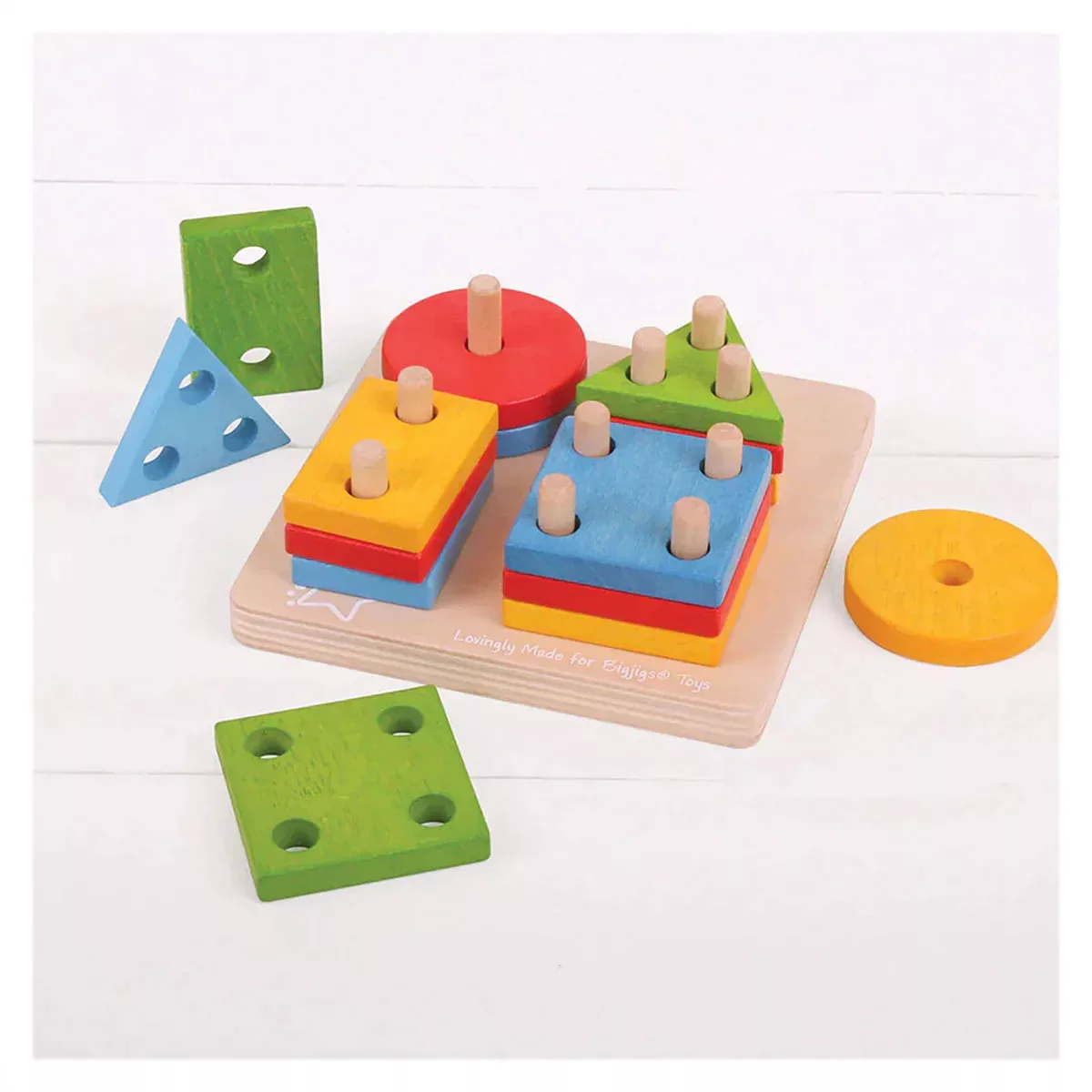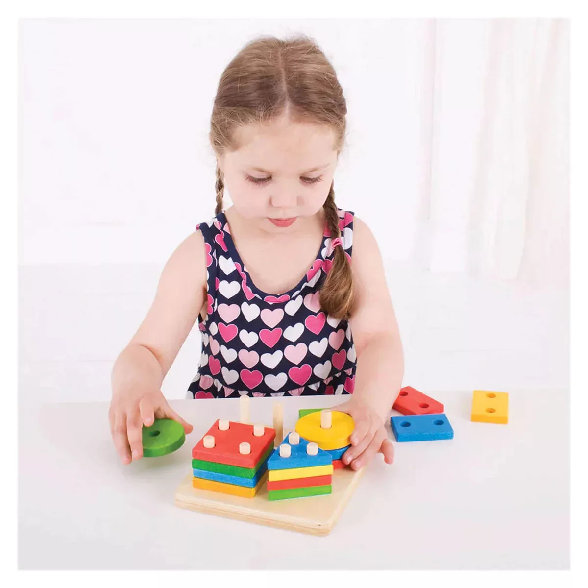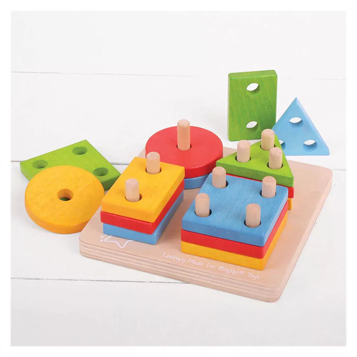 Ez a klasszikus forma- és színbesoroló játék arra ösztönzi a gyerekeket, hogy színes fa alakokat illesszenek a megfelelő helyre. A négy alapforma – kör, négyzet, háromszög és téglalap – segíti a formák és színek felismerését már egészen korán.
