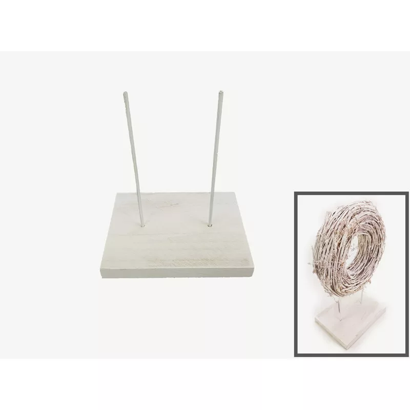 Fehér koszorútartó állvány, 2,5 cm vastag fa talapzattal. Állított koszorút eddig csak falon és ajtón lehetett elhelyezni, de ezzel az elemmel szekrényre, vagy asztalra is tehetjük a díszünket.
