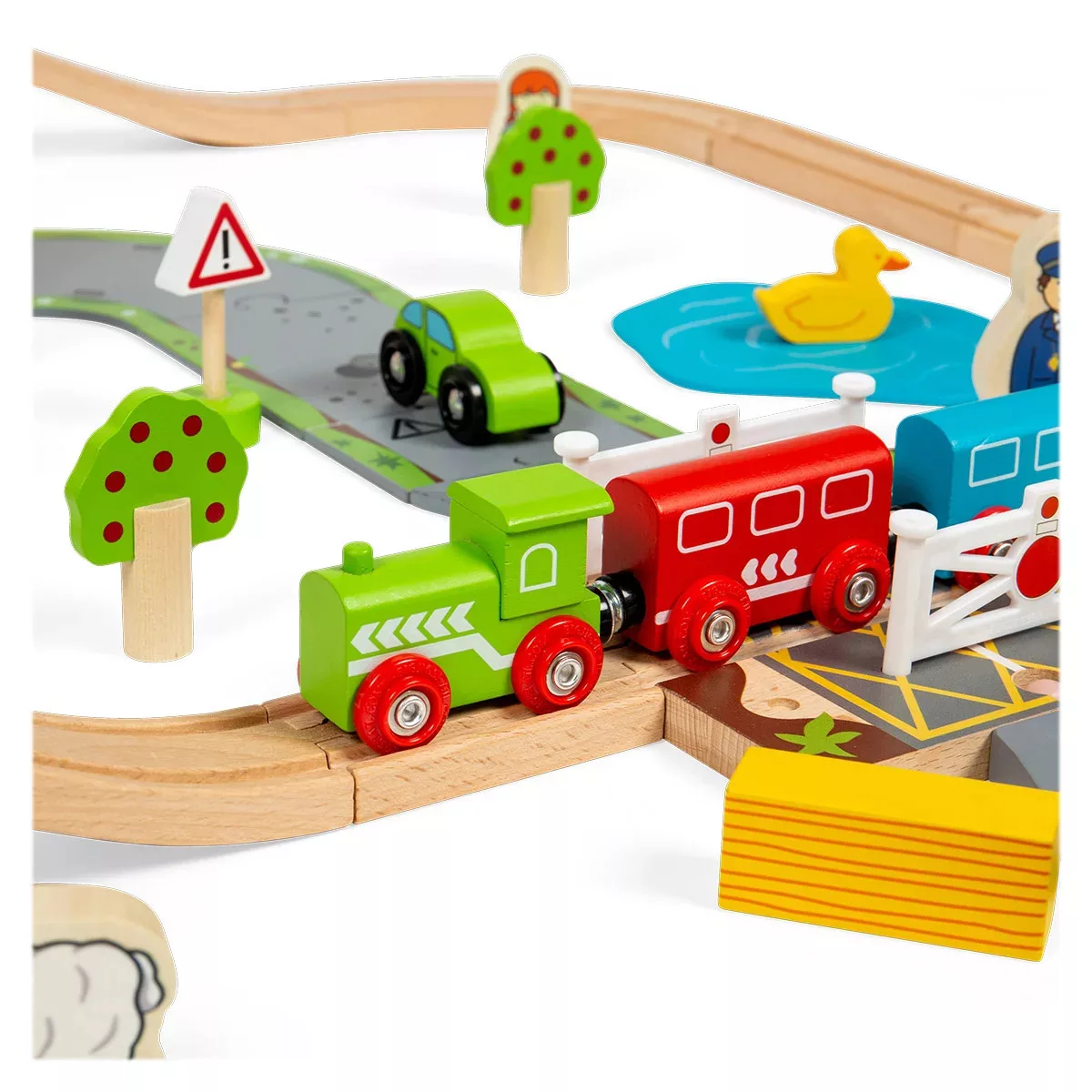 Fedezd fel a játék korlátlan lehetőségeit ezzel a fa készlettel! A játék ötvözi a vasúti és közúti forgalmat, így a vonat és a gyermekautók egyszerre közlekedhetnek a pályán és az úton. A két szintű pálya alatt átvezetett úton a kis járművek áthaladnak az emelt sín alatt vagy át a működő szintbeni átkelőn.