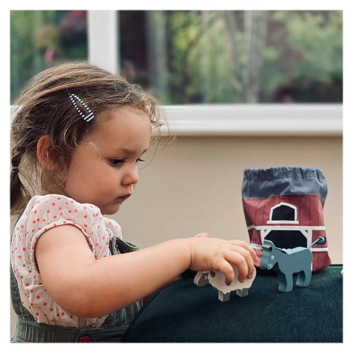 • A szett 13 darabot tartalmaz: 10 népszerű háziállatot, egy talicskát és egy szénabálát, mindezeket pedig egy bájos, pajtával mintázott textilzsákban lehet tárolni.