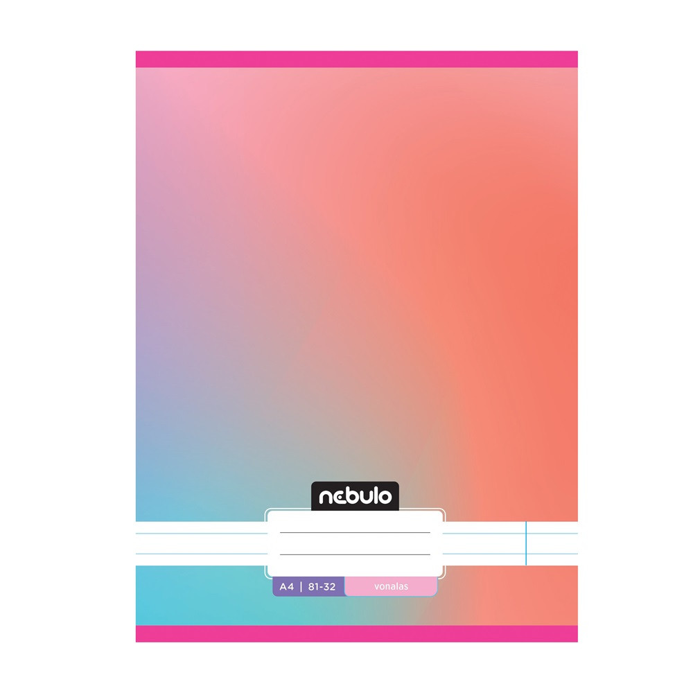 A/4-es tűzött iskolai vonalas füzet, 32 lapos (81-32). 12 db füzet (6 különböző minta: Monochrome=egyszínű, Gradient=színátmentes, 2db / minta) van egy csomagban. 70 g-os füzetlapok és 200 g-os műnyomó borító fényes fóliával.