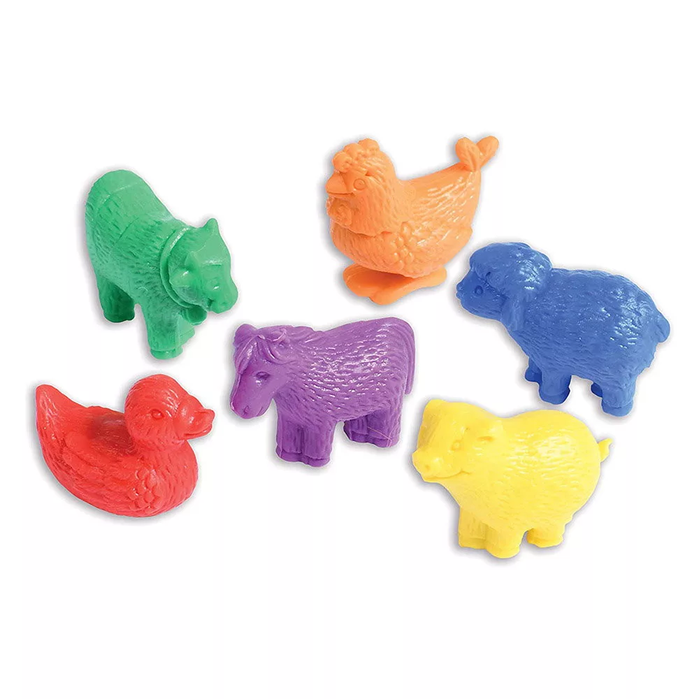 • A készlet 36 darab gumírozott műanyag háziállatfigurát tartalmaz, 6 fajt képviselve (csirke, tehén, kacsa, ló, disznó, birka) 6 különböző színben (piros, kék, zöld, sárga, lila és narancs) és egy nagy műanyag fogót a kezeléshez.