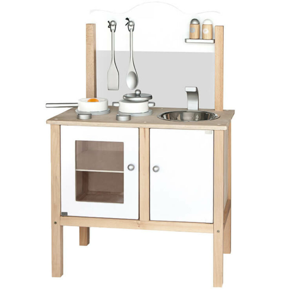 A Játékkonyha (fehér) egy elegáns, visszafogott színvilágú fa konyha, amely valósághű, biztonságos játékteret biztosít a sütés-főzés kipróbálásához. A gyerekek különféle konyhai helyzeteket játszhatnak el, miközben észrevétlenül fejlődik kreativitásuk, kézügyességük, kíváncsiságuk és képzeletük.