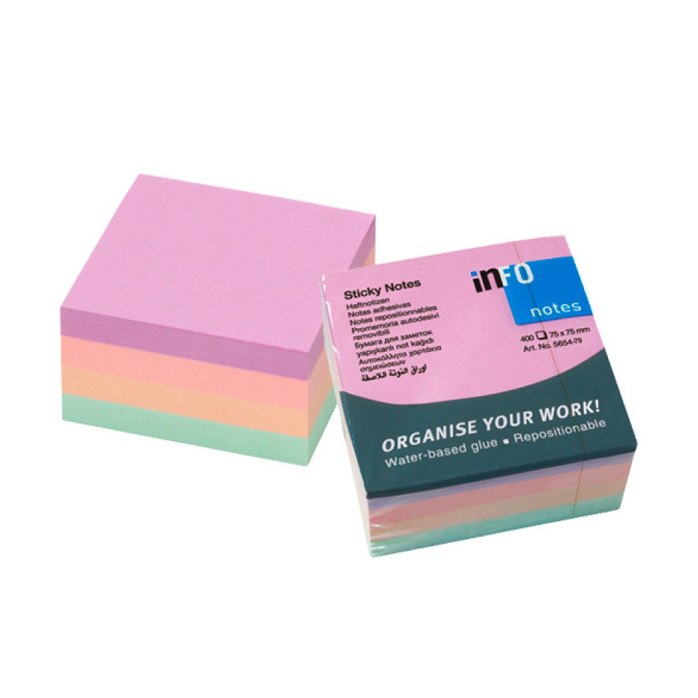 Jegyzettömb öntapadó, 75x75mm, 400lap, 4x100lap, Info Notes, harmony mix, lila, világos rózsaszín, világoszöld, barack
