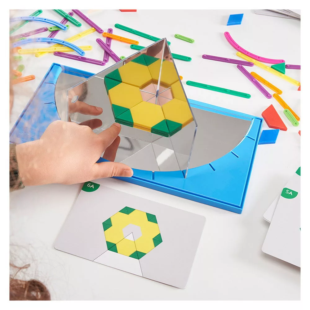 • A készlet tartalma: 4 akril tükör, 3 függőleges akril tükör, 1 műanyag keret 15 fokos átmenettel, 30 színes műanyag geometriai forma, 50 GeoStix, 64 db kétoldalas tevékenységkártya és egy angol nyelvű tevékenységi útmutató.