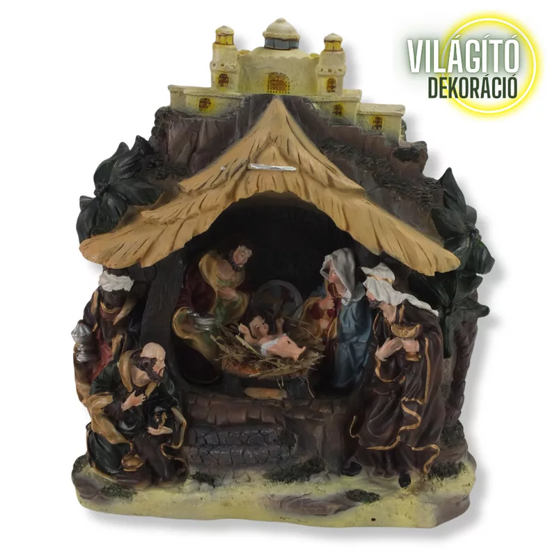 Hozd el otthonodba a karácsony varázsát ezzel a gyönyörű asztali betlehemmel!  Aprólékosan kidolgozott figurák és a hangulatos LED fény együtt teremtik meg a meghitt, ünnepi hangulatot. A betlehem minden részlete a hagyományos születésjelenetet idézi meg, így nemcsak dísz, hanem igazi karácsonyi élmény is. A meleg fény finoman kiemeli a figurákat, és különleges légkört varázsol az otthonodba.