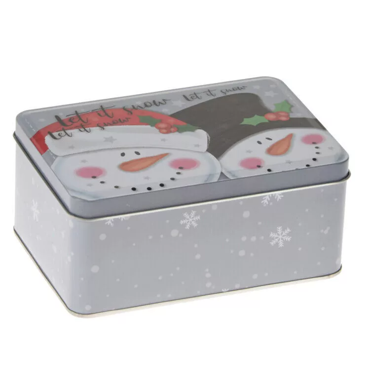 Téglalap alapú, kis méretű, fém díszdoboz hóember mintával. Alkalmas karácsonyi ajándékok csomagolására, de tárolódobozként sütemények, édességek, vagy kisebb használati cikkek tárolására is használható.