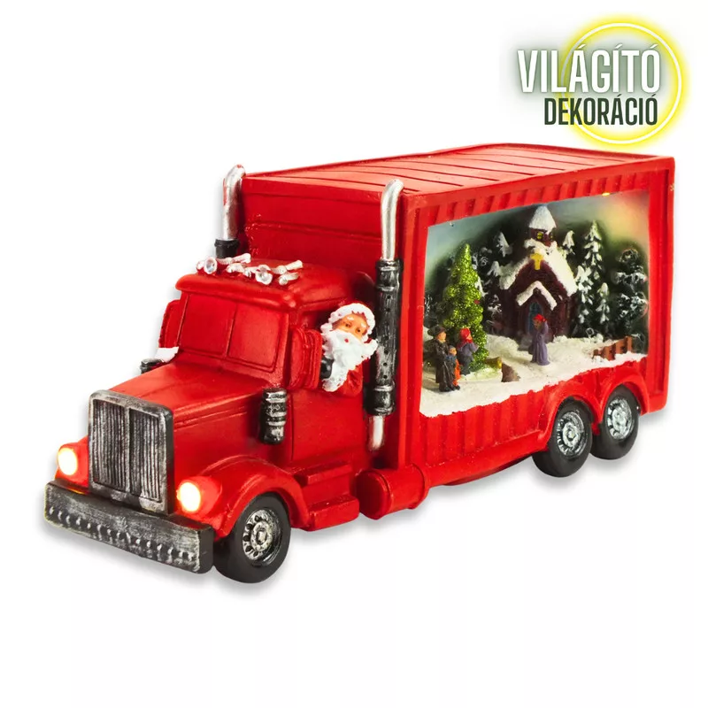 Igazán egyedi, ünnepi hangulatot hozó piros világítós kamion. A Mikulás kamionjának belsejébe bekukkantva egy kisváros makettje tárul eléd, házakkal, égbolttal, csillogó forgó fenyővel a közepén és a város lakóival. A részletesen kidolgozott jelenet fényszórókkal világított kamionnal és kivilágított belső kisvárossal még különlegesebbé teszi az ünnepi dekorációt.