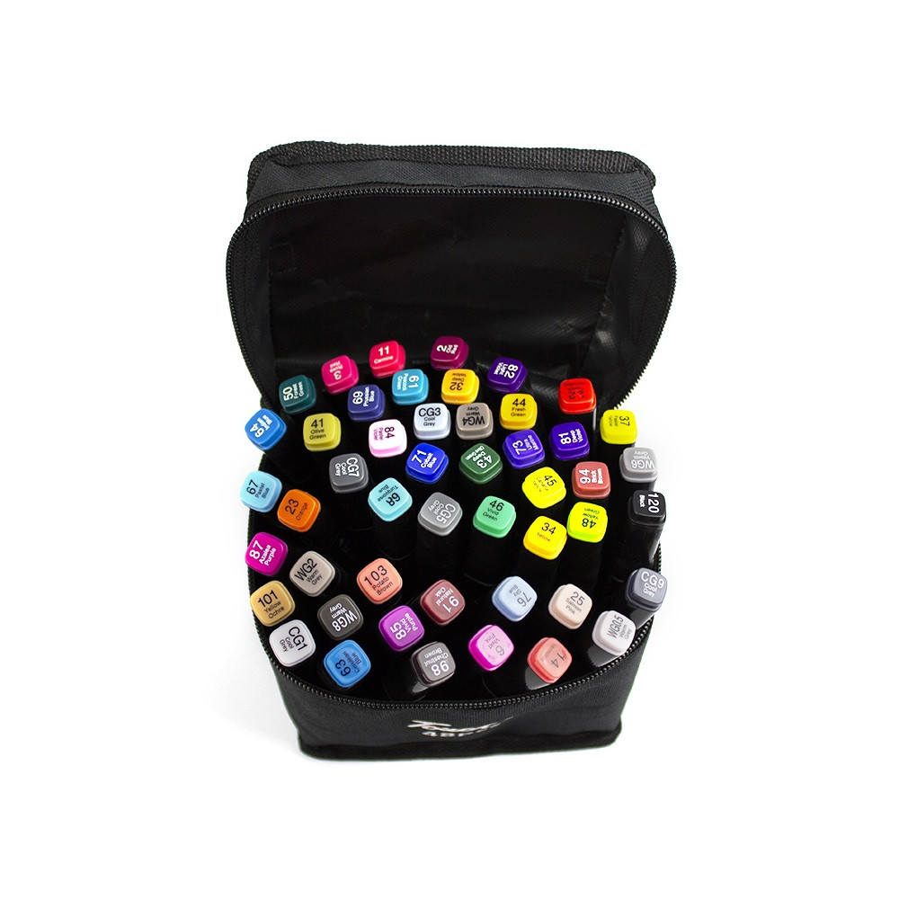 48 db kétvégű, alkoholos marker. Víz - és fakulásálló erősen pigmentált színek, melyek nem hagynak nyomot. Hegyvastagság: 3 mm és 6 mm. Vonalvastagság: 0,5 mm - 6 mm. A tok anyaga rugalmas, zipzárral és fogóval ellátott. Katalóguskód: 53955