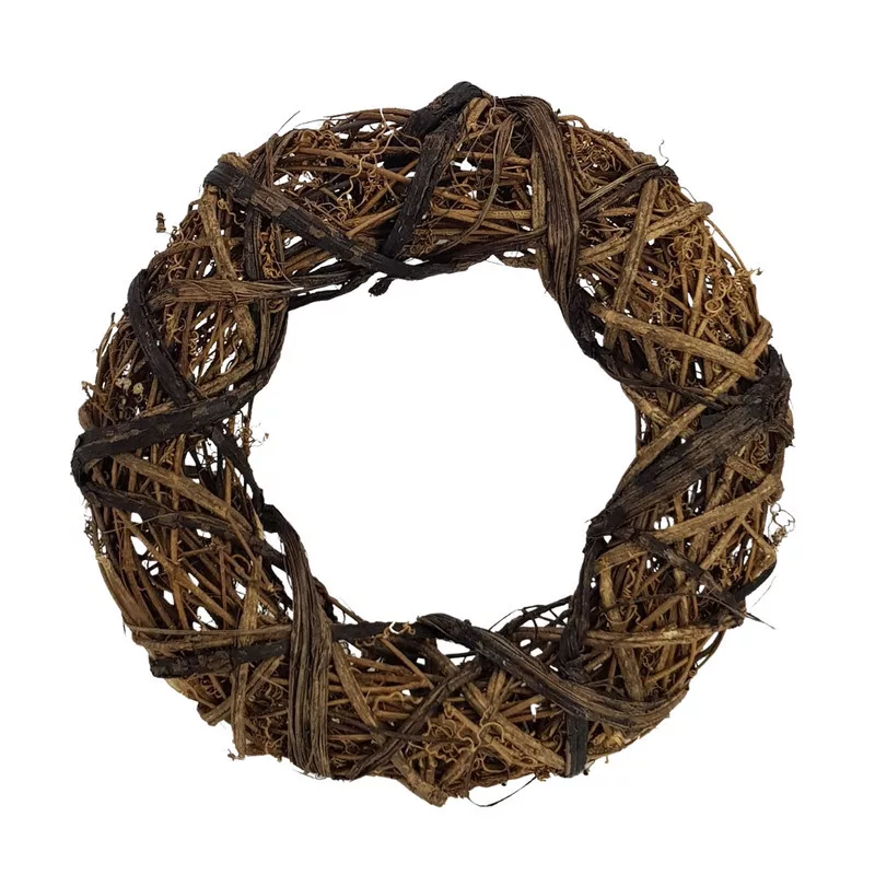 Fém váz alapú, masszív, barna indákkal körbetekert koszorú. Egzotikus és látványos koszorúalap, ami könnyedén díszíthető és beleillik a tavasztól őszig tartó összes szezonális dekorációba.