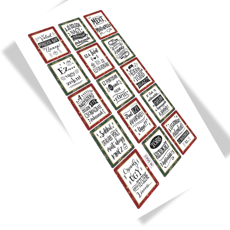 Egyedi tervezésű, saját gyártású humoros matricák, amelyek feldobják az ajándékcsomagolást és mosolyt csalnak az arcokra. Egy íven 15 darab matrica található – tökéletes választás dobozok, tasakok vagy ajándékkísérők díszítésére, hogy még vidámabb és személyesebb legyen az ünnepi csomagolás.