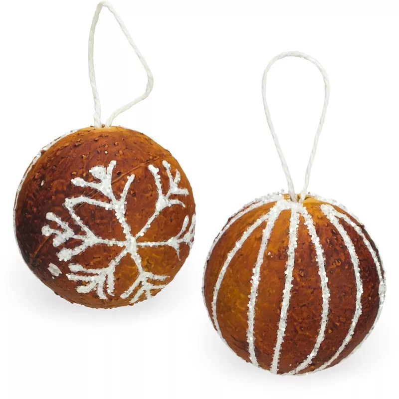Két darabos gömb alakú mézeskalács karácsonyfadísz szett, akasztókkal ellátva.
