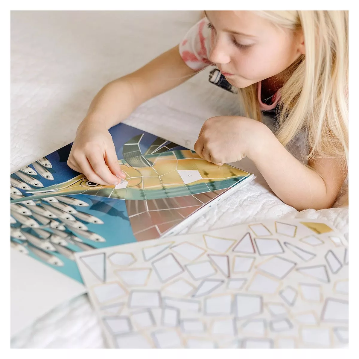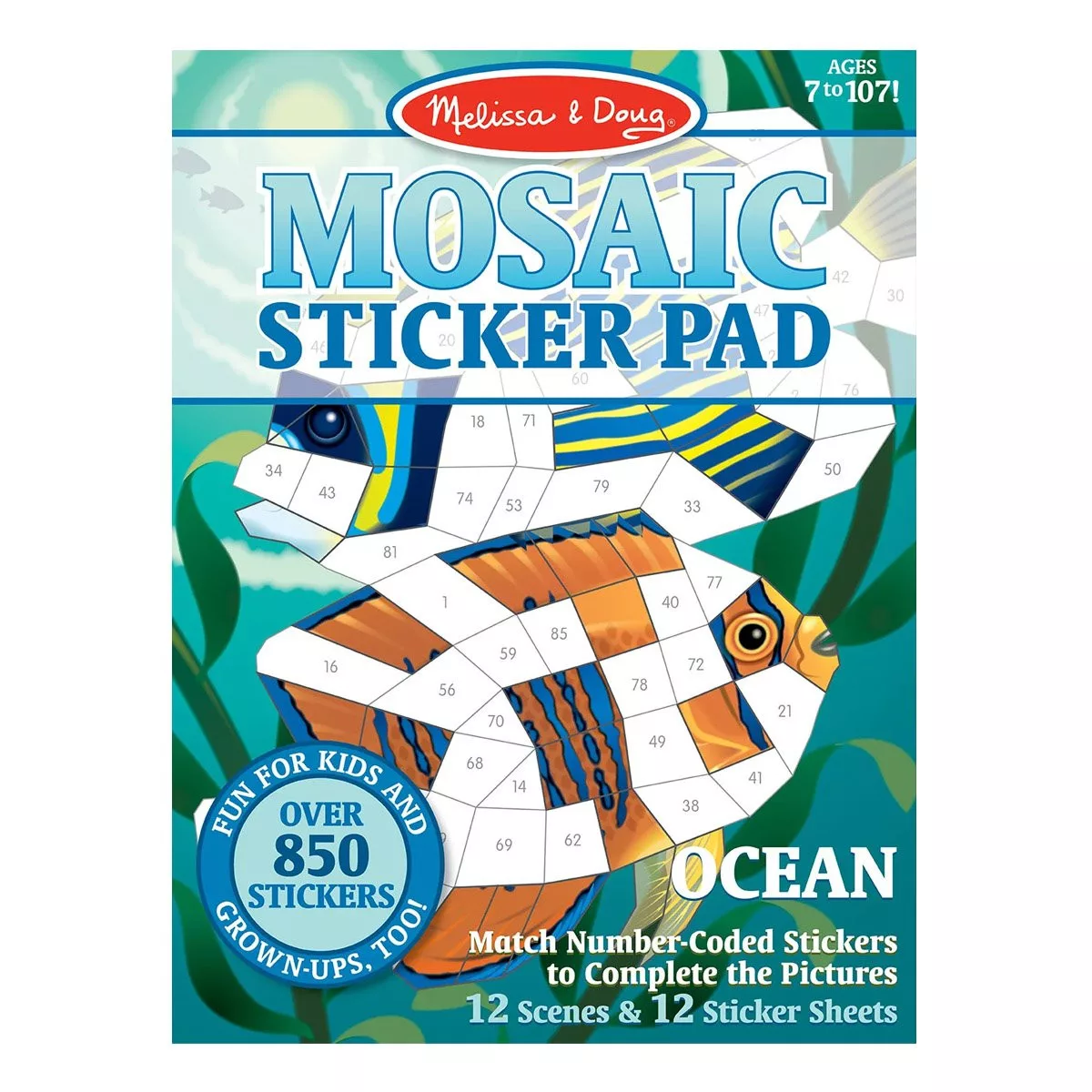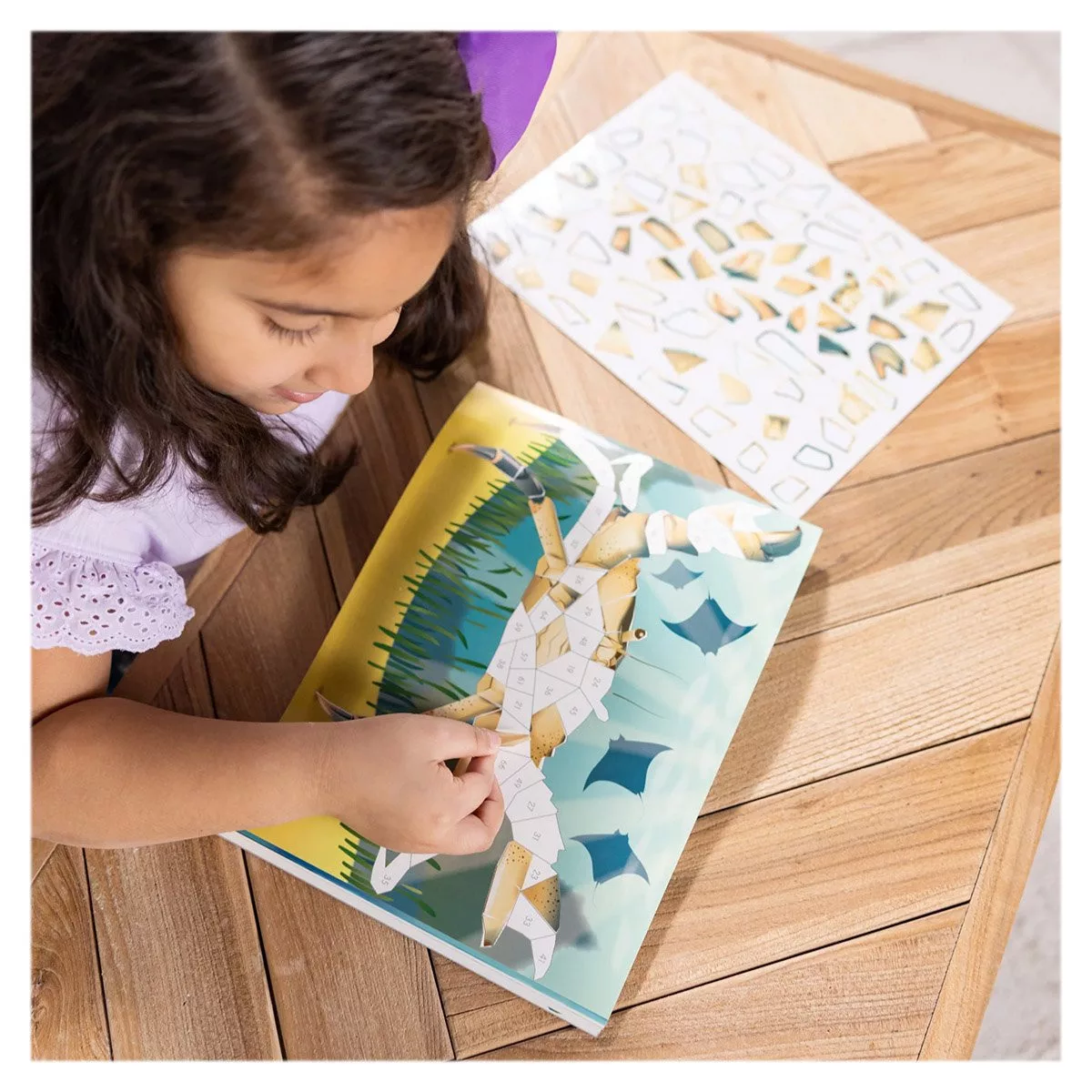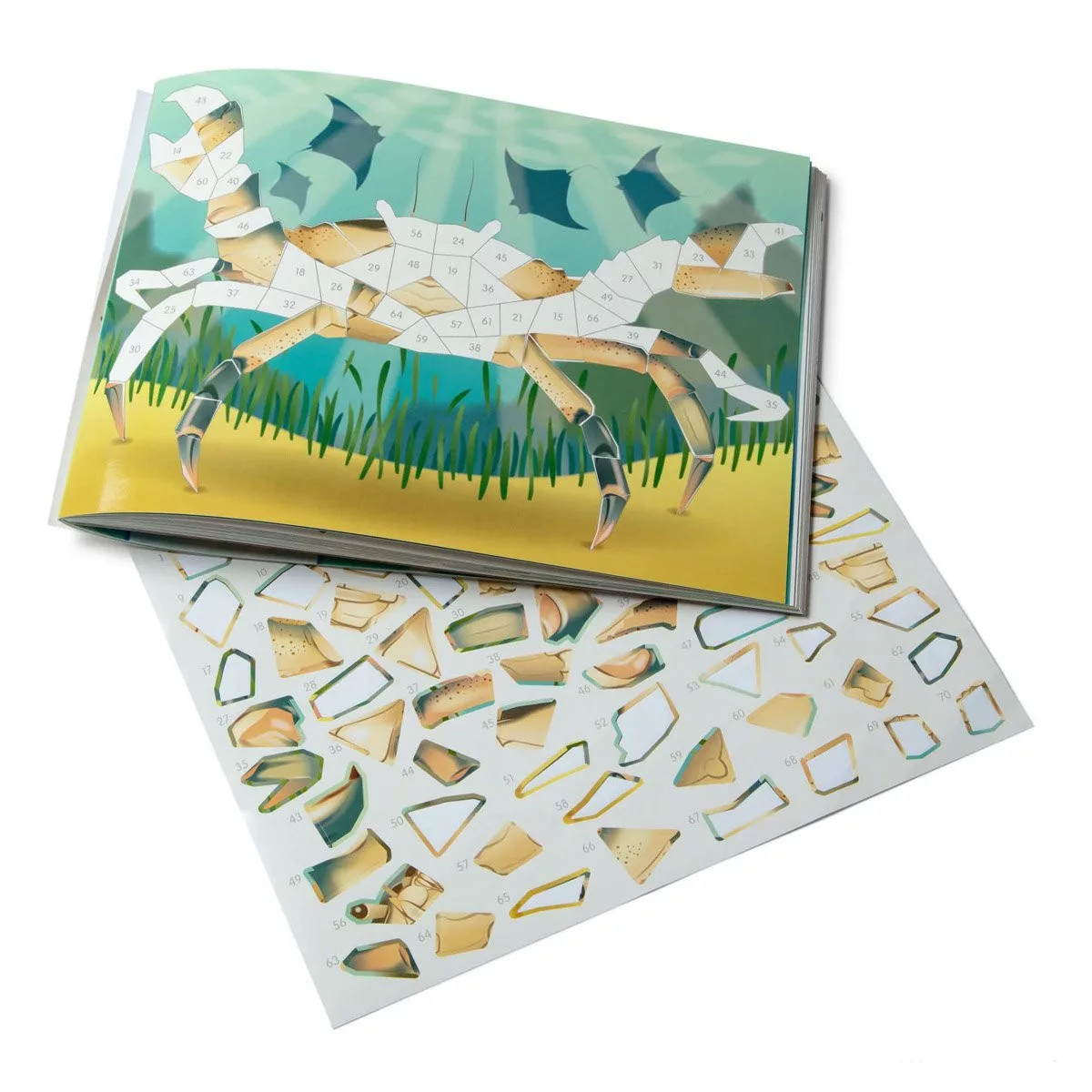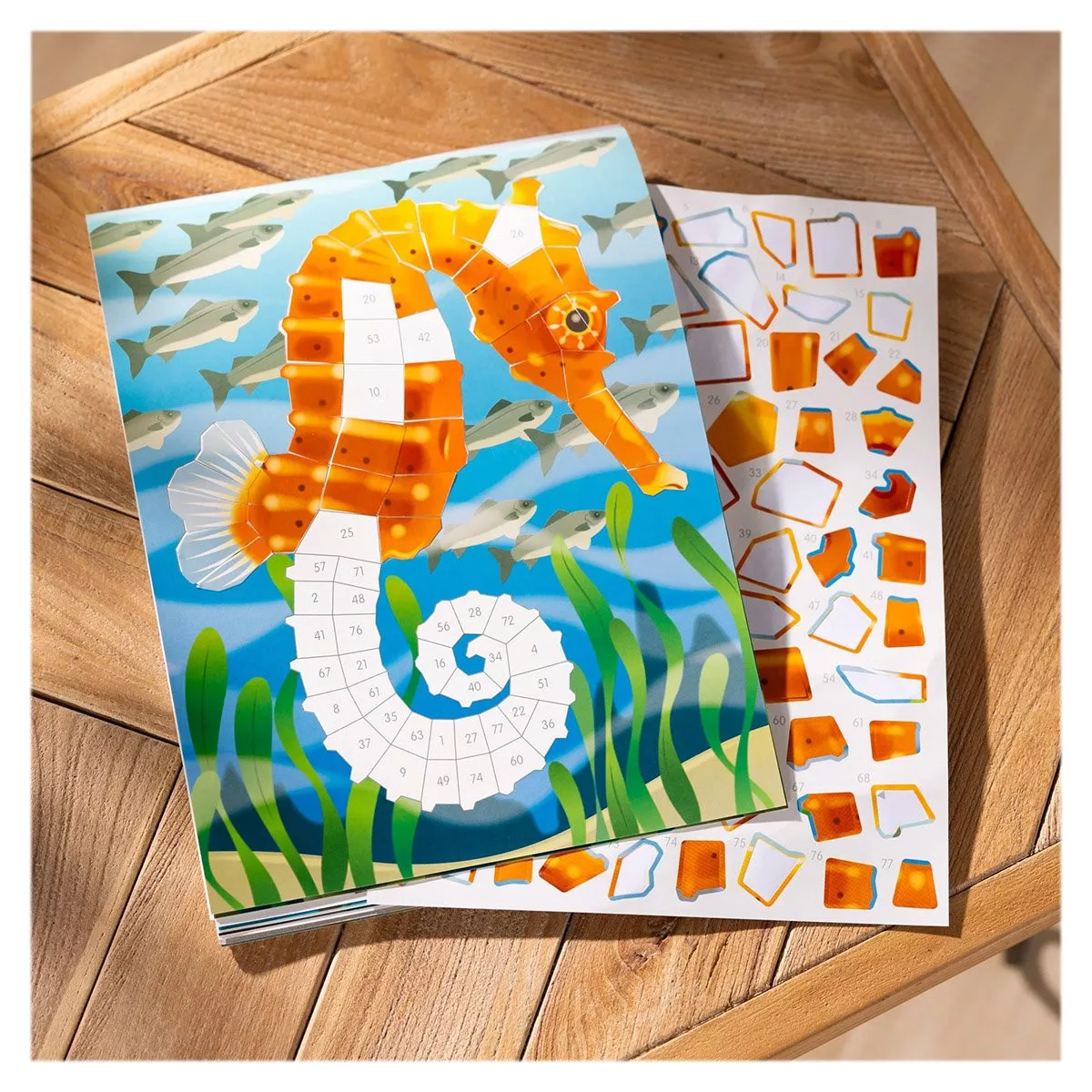 • Találtasd a számozott matricákat a 12 színes mozaiklap számozott mezőihez, keltsd életre a víz alatti lényeket.