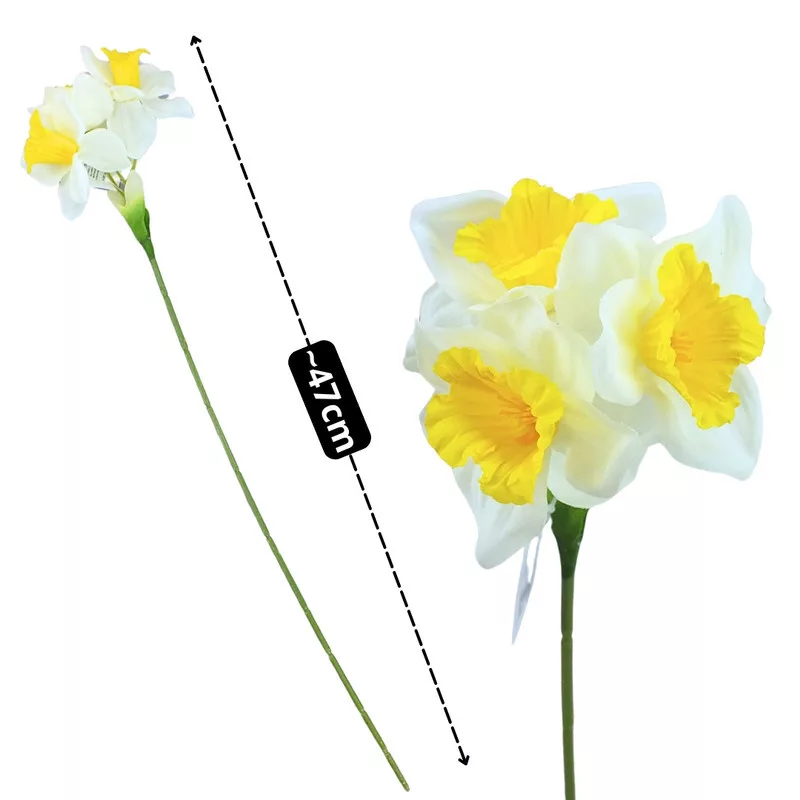 1 szál nárcisz, nyitott virágfejű, élethű megjelenésű, formázható műanyag szárral. Ideális választás vázákba, koszorúkhoz, ajtódíszekhez, csokrok kiegészítésére, vagy akár önálló dekorációként is. Kiváló minőségű anyagból készült, így tartós és sokoldalúan felhasználható.