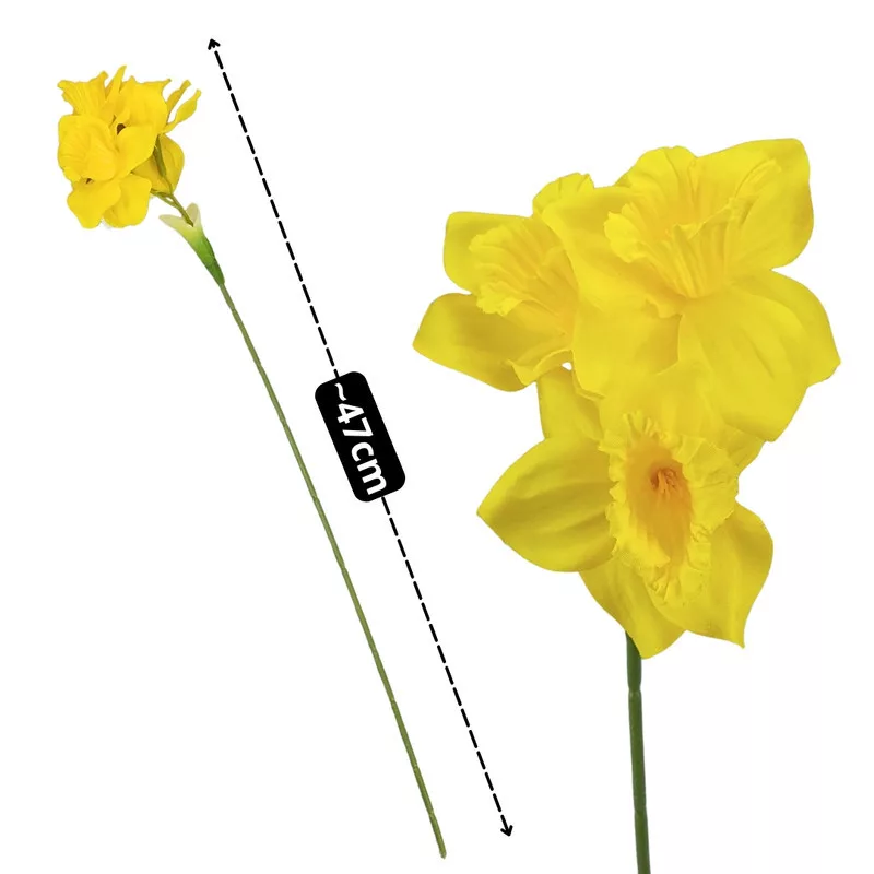 1 szál nárcisz, nyitott virágfejű, élethű megjelenésű, formázható műanyag szárral. Ideális választás vázákba, koszorúkhoz, ajtódíszekhez, csokrok kiegészítésére, vagy akár önálló dekorációként is. Kiváló minőségű anyagból készült, így tartós és sokoldalúan felhasználható.