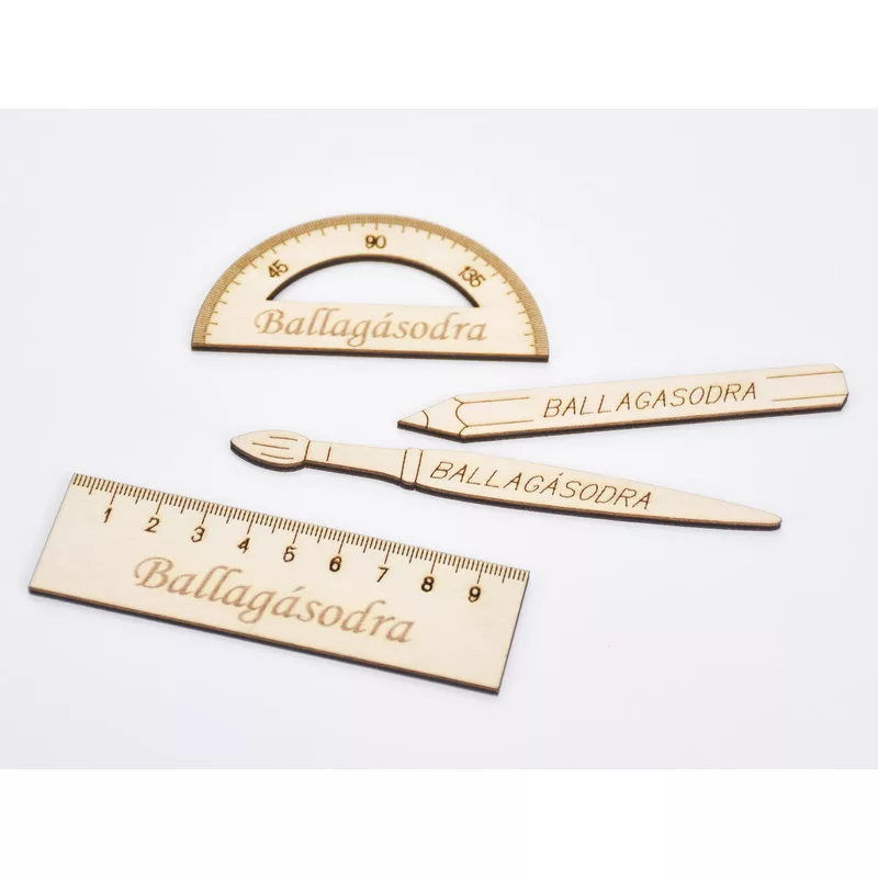 Saját gyártású fatermék. Dekorfestékkel és lazúrral festhető. Ballagási ajándékok, csokrok díszítéséhez ajánljuk. Szögmérő: 8x4cm, vonalzó: 10x3cm, ceruza: 10x1,1cm, ecset: 12x1,1cm