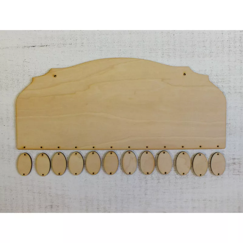 35x15cm tábla melyről 12 ovális táblácska lógatható le. Naptár készítésére kiválóan alkalmas. Plusz kiegészítő ovális táblácskákat is vásárolhatsz hozzá.