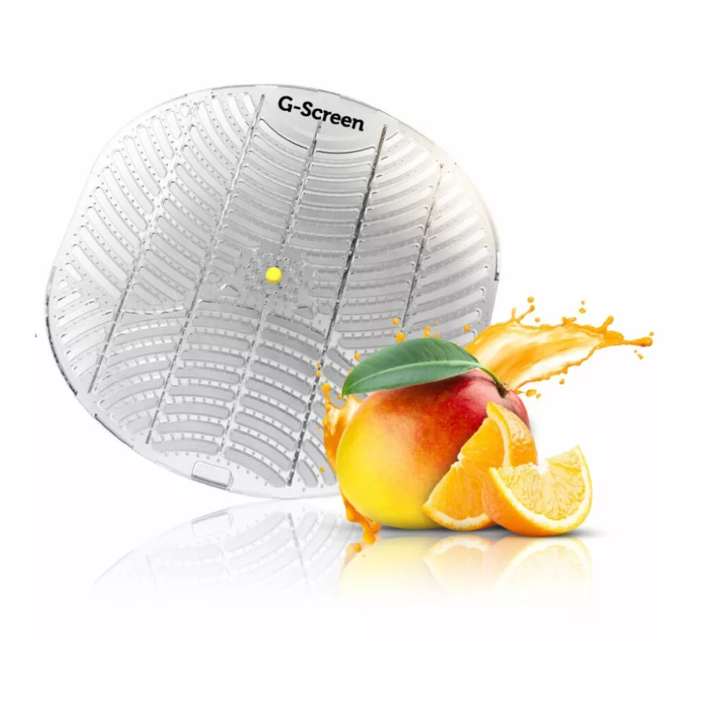 A G-Screen piszoár rácsok, a piszoár higiéniai termékek első generációs modelljei. Anyaguk, a fenntarthatóság jegyében, az újrahasznosítható EVA. A G-Screen piszoár szűrők, formájukat tekintve a fizikai szennyeződések kivédésére lettek tervezve, továbbá felületi kialakításuk által a visszafröccsenés kellemetlen jelenségét is megakadályozzák. Ezek a rácsok használat közben nem mozdulnak el, rugalmasak, de képesek fixen tartani a helyüket, ezáltal szinte minden formájú piszoárba beleilleszthetők. A mérnökök úgy alkották meg a G-SCREEN piszoár rácsok formáját, hogy a lehető legkisebb esélye legyen annak, hogy a szennyeződés átjusson rajta, mindezek mellett fröccsenésmentes használatot biztosít.Egyedi csúszásgátló kialakítása segíti, hogy optimális helyzetben maradjon, használat után pedig kis fogantyú segítségével könnyen kiemelhető. Az illatanyaggal átitatott pissoir rács használattól függően akár 30 napig illatozik, és segít frissen tartani a férfi mosdók légterét. Citrus mangó - Trópusi vidámság a lédús mangó és a napérlelt citrus illataival.
