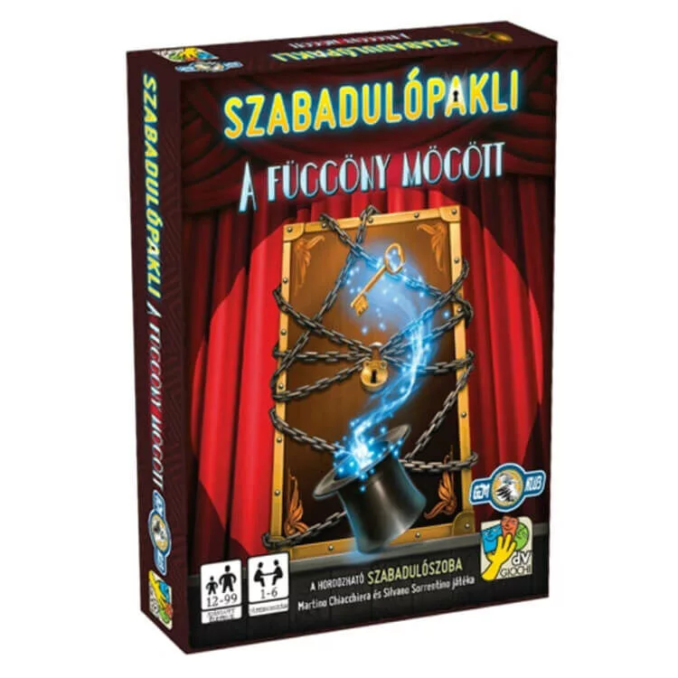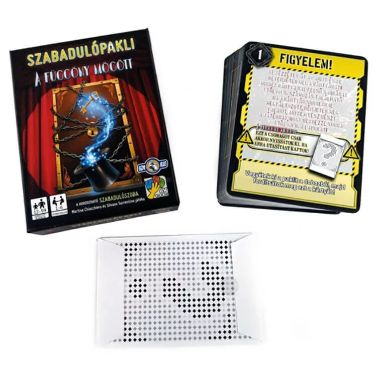 A szabadulópakli: A függöny mögött társasjátékot bárhova magunkkal vihetjük kicsi dobozméretének köszönhetően, így "bárhonnan" kiszabadulhatunk. Egy névtelen boríték érkezett, melyben ingyen jegyeket találunk a híres mágus, Lance Oldman telt házas bűvészműsorára New Yorkban. Hamarosan indulni kell, az este önfeledt szórakozást ígér, de vigyázzunk, ha varázslatról van szó bármi megeshet! Miután elfoglalták a nézők ülőhelyeiket, kezdetét veszi a várva várt előadás. Miközben megpróbálják a nézők kitalálni, mi a nyitja egyik-másik bűvésztrükknek, az események váratlan fordulatot vesznek! A függöny mögött szabadulópakli nagyobb társaságnak, vagy akár 1 főnek is remek szórakozást nyújt. Tartalom: - 60 extra méretű kártya - 1 titkos terv kártya - Magyar nyelvű leírás