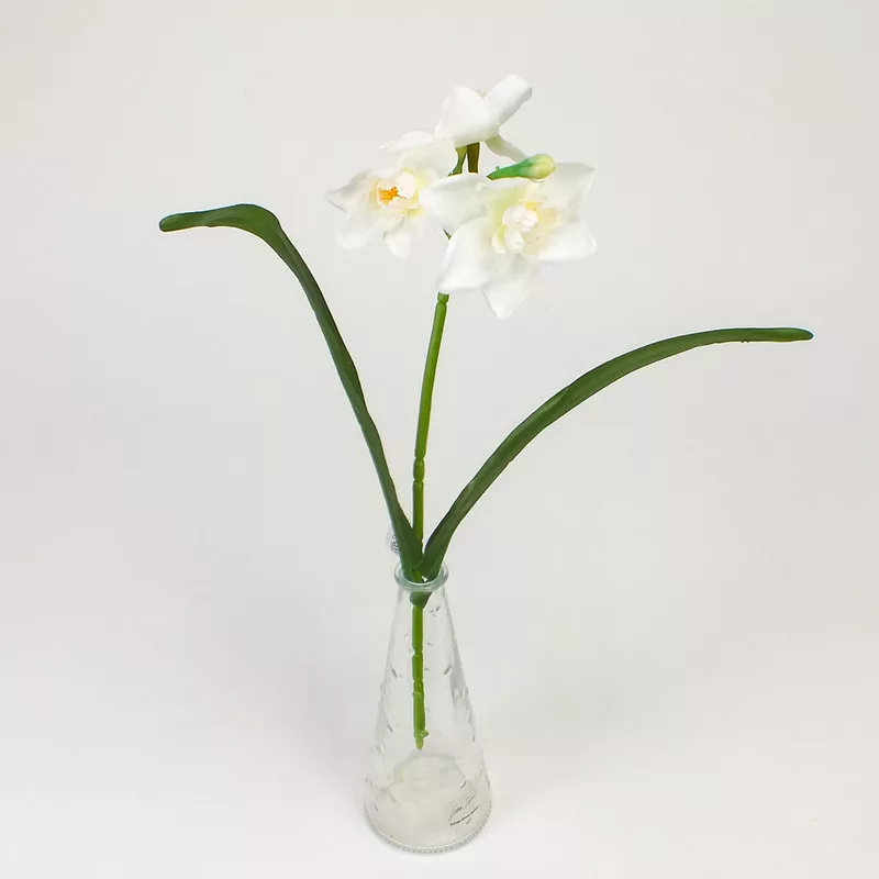 A fehér színű szálas nárcisz három virágfejjel elegáns és időtálló dekorációs megoldás. Karcsú szára és a háromfejes kialakítás természetes, harmonikus megjelenést biztosít. Kiválóan használható koszorúkhoz, asztaldíszekhez, virágdobozokhoz vagy önálló dekorációs elemként is. Letisztult színe könnyen kombinálható más tavaszi virágokkal és dekorációs kiegészítőkkel. Tartós kivitelének köszönhetően hosszú ideig megőrzi szép megjelenését, így ideális választás tavaszi és ünnepi dekorációkhoz.