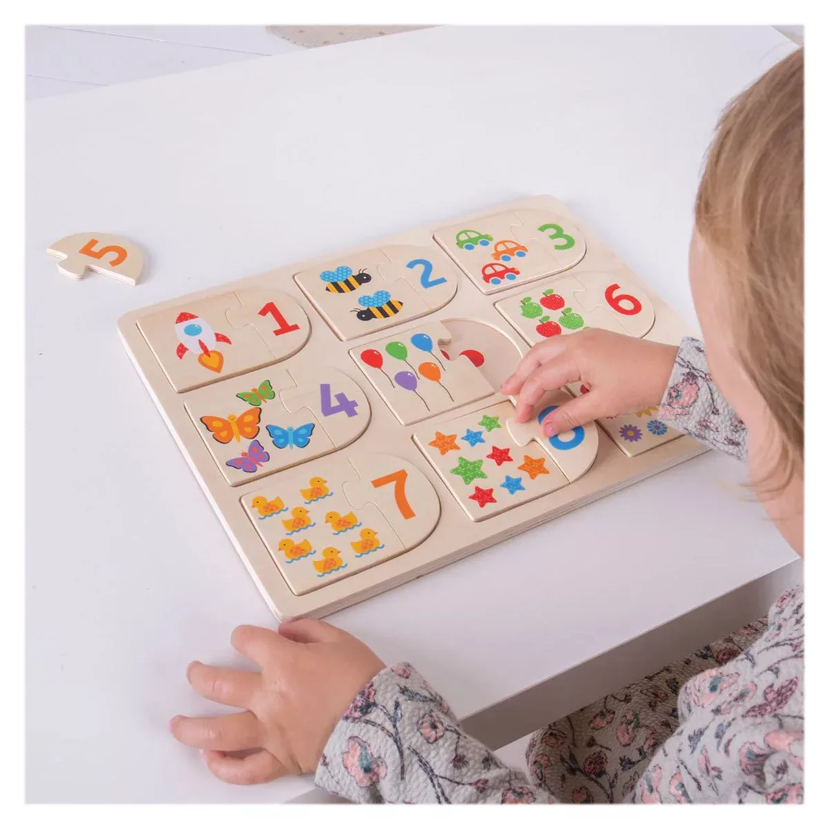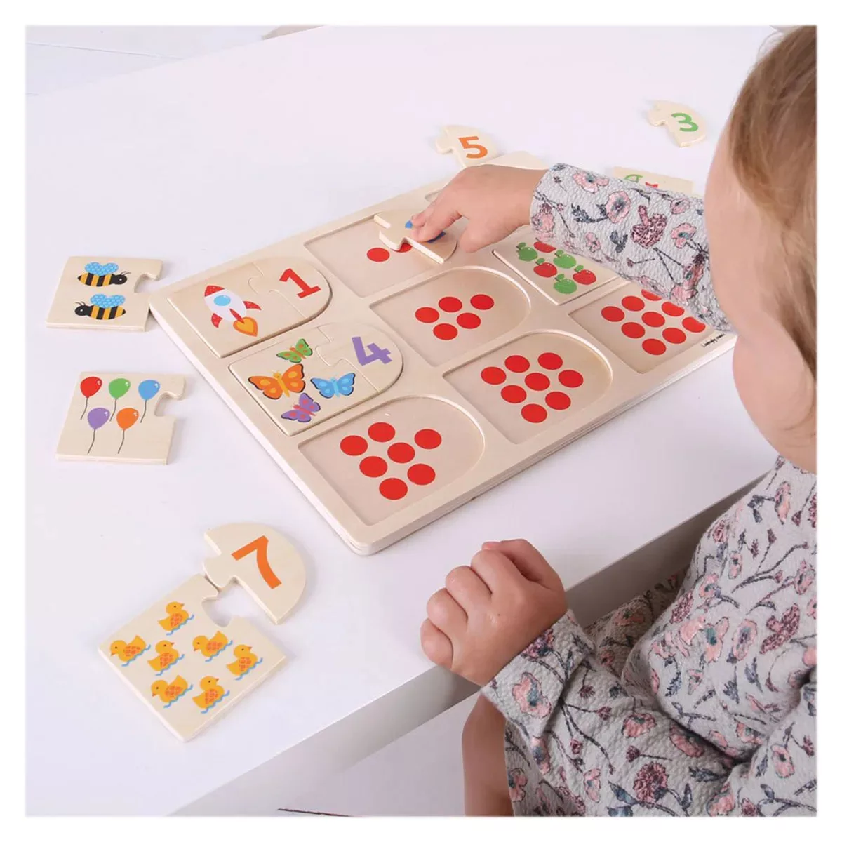 A játék nemcsak egyszerű puzzle-élményt nyújt, hanem számnév azonosítást, mennyiség-érzékelést és párosító készséget is tanít. A színes képek szórakoztató és vizuálisan ösztönző kihívást adnak minden egyes párosításnál.