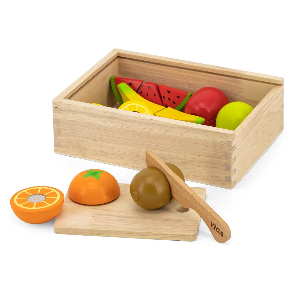 A Szeletelhető gyümölcsök dobozban (Viga) élethű élményt kínál a játékkonyhában. A kicsik biztonságosan „főzhetnek”, szeletelhetnek és tálalhatnak, miközben észrevétlenül fejlődnek.