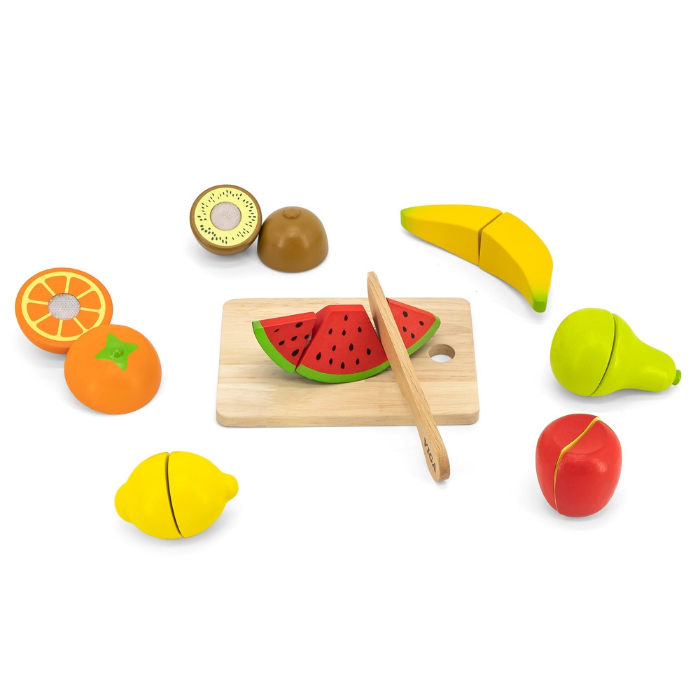 A 7 féle gyümölcs tépőzárral félbe vagy több részre szeletelhető, majd könnyen újra összeilleszthető. 18 hónapos kortól fejleszti a finommotorikát, a kéz–szem koordinációt és a kreatív szerepjátékot – otthonra és Intézményeknek egyaránt ajánlott.