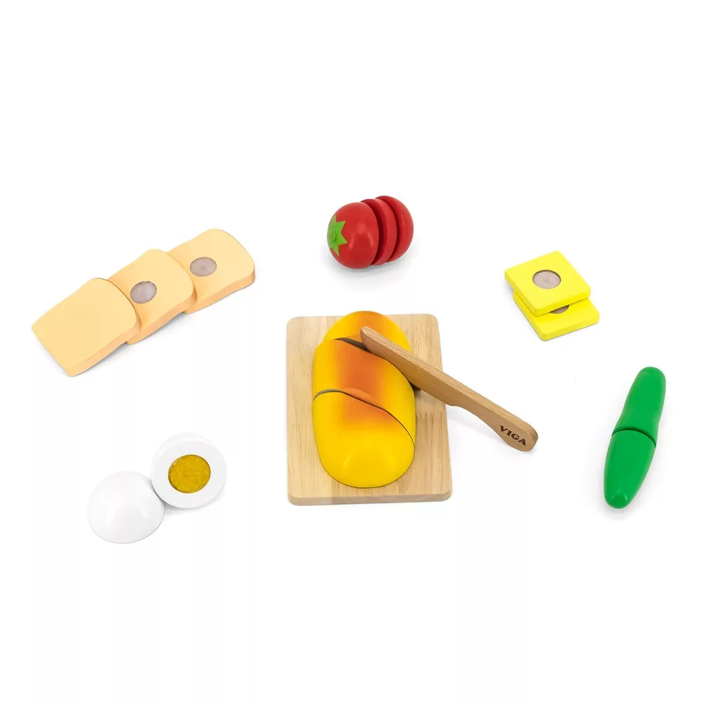 A szett egy vágódeszkát, egy játékkést és egy fa tárolódobozt tartalmaz átlátszó akril tolófedéllel az egyszerű pakolásért. A reggeli alapjai – kenyér, tojás, uborka, pirítós, paradicsom és vajszeletek – mind szeletelhetők, majd tépőzárral könnyen újra összeilleszthetők, így a „menü” végtelenül variálható.