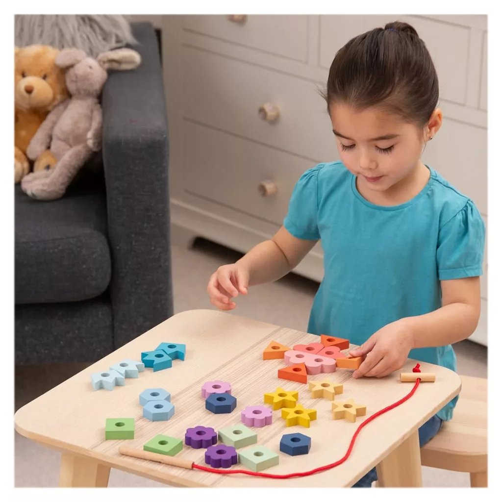 • A készlet tartalma: 28 fából készült forma 7 különböző alakban (virág, hatszög, korona, négyzet, csillag, háromszög és szív) és 1 fa véggel ellátott fűző, a könnyű és biztonságos felfűzéshez.