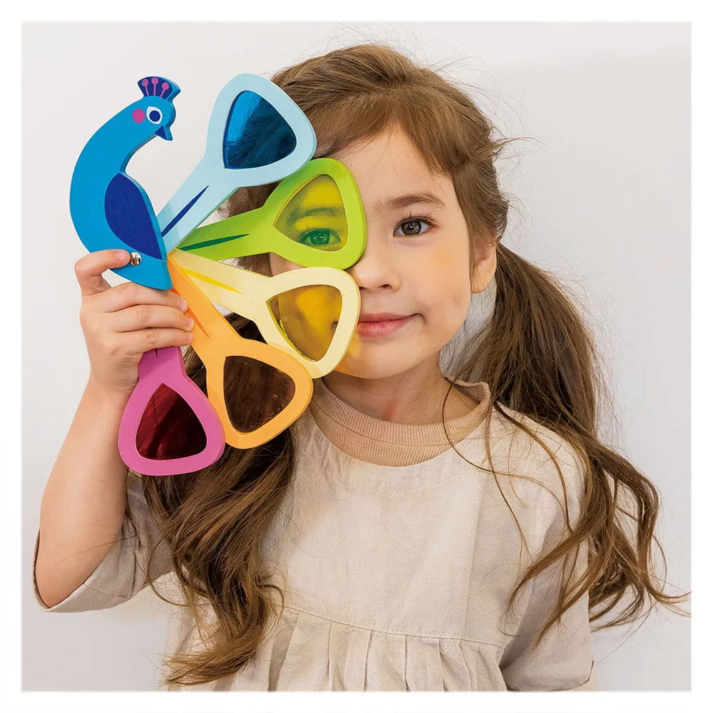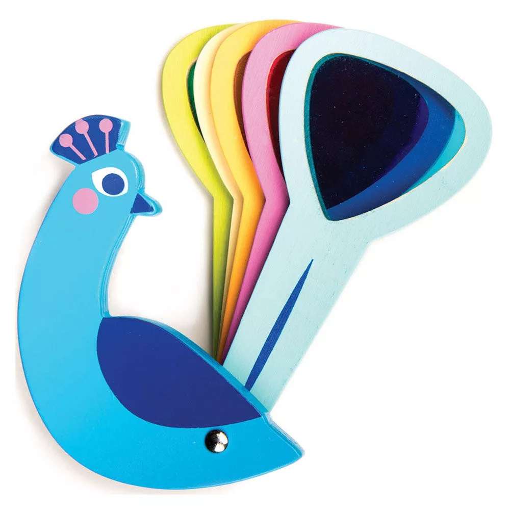 • A fából készült páva öt színes akrilablakkal rendelkezik, amelyekkel a gyerekek más színekben láthatják a világot, vagy kombinálhatják őket új árnyalatok létrehozásához.
