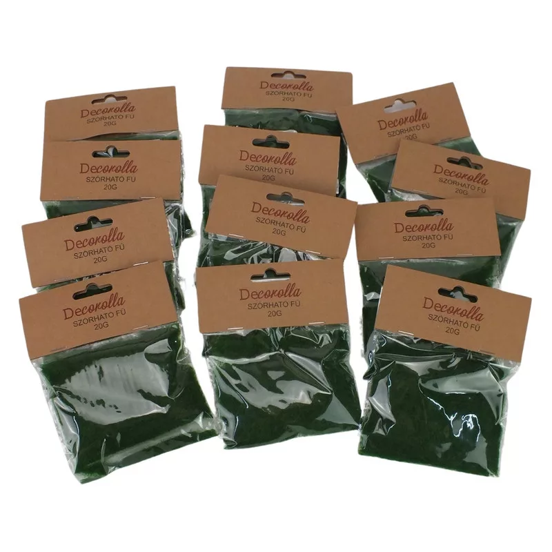 A sötétzöld szórható fű makettekhez, kirakatokhoz szánt füves felület kialakítására való kiegészítő. Ragasztóval kombinálható.