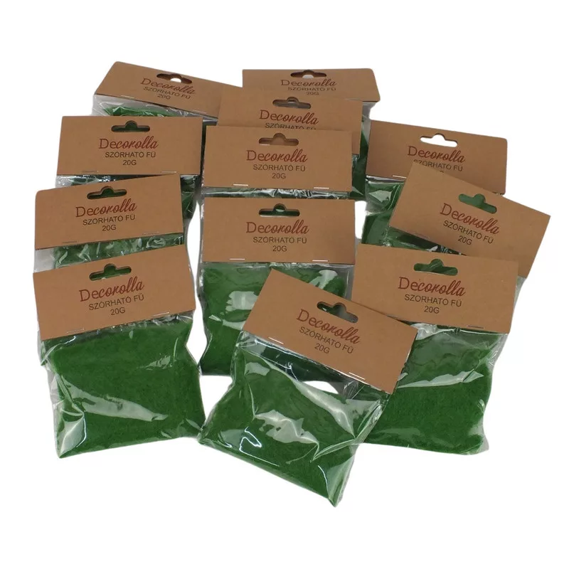 A sötétzöld szórható fű makettekhez, kirakatokhoz szánt füves felület kialakítására való kiegészítő. Ragasztóval kombinálható.