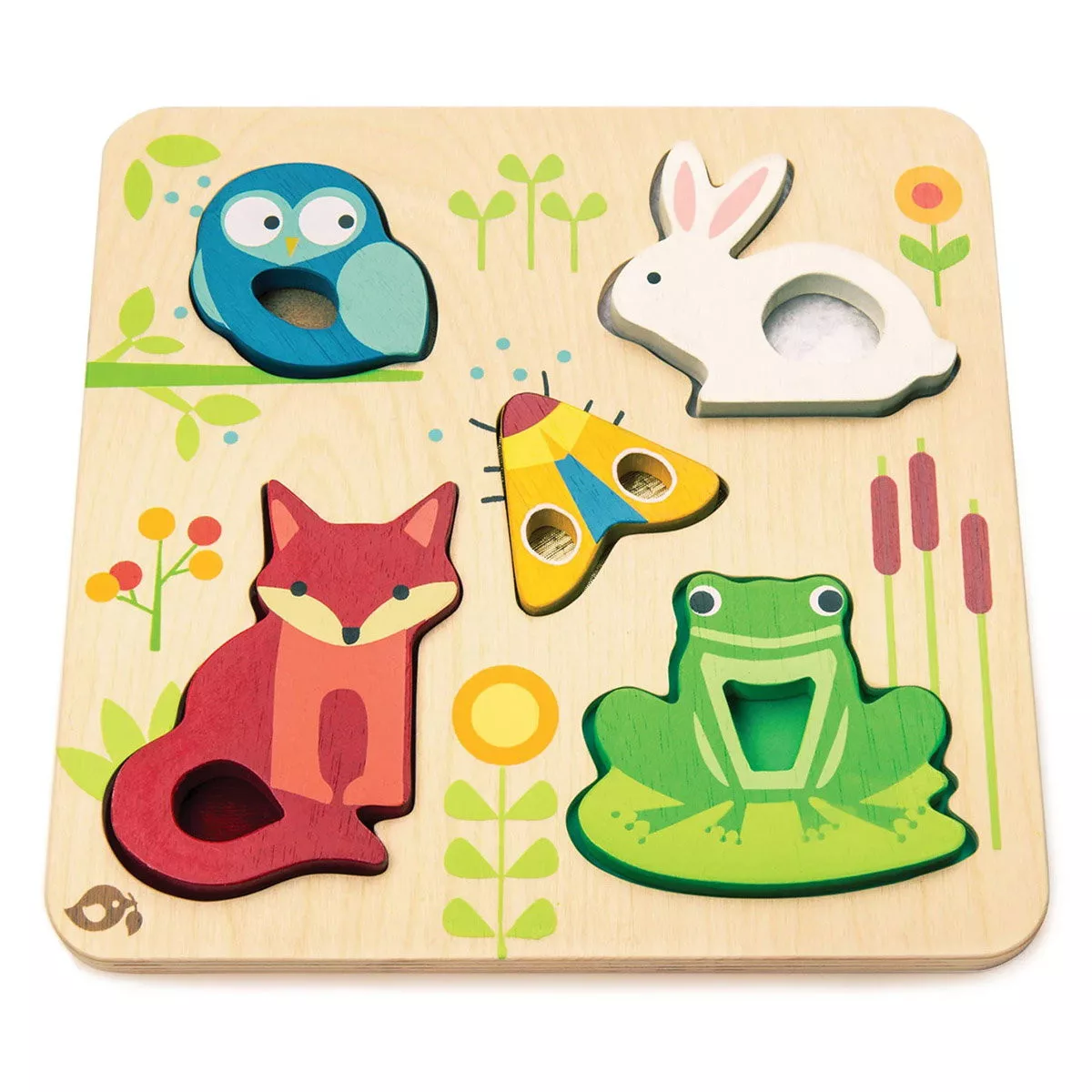 • A Tender Leaf Toys állatos tapintós puzzle-je egy bájos fa kirakó 5 vidám, színes állatfigurával.