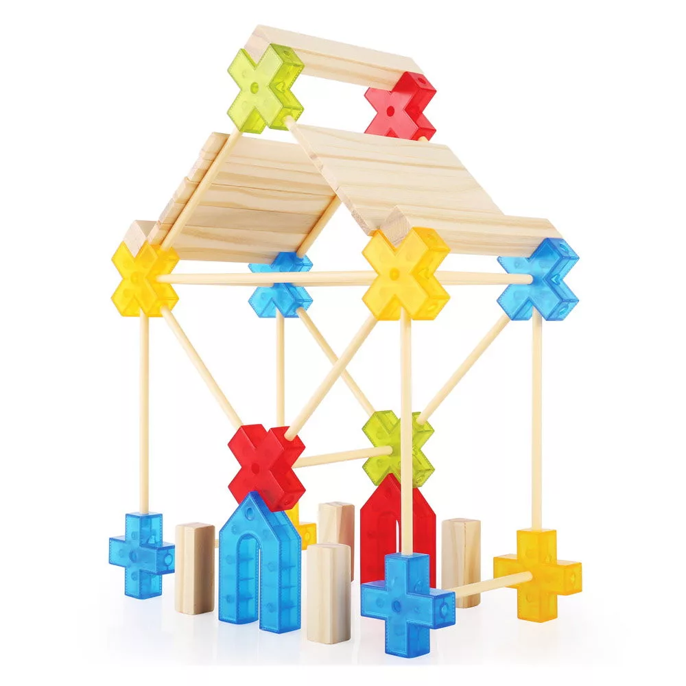 • A készlet 100 darabot tartalmaz műanyag rudak, fa deszkák és színes geometriai csatlakozók formájában, valamint egy tevékenységi útmutatót kreatív instrukciókkal.