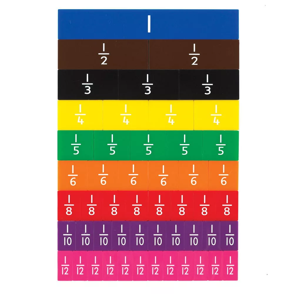 • A készlet 51 darab kemény műanyag darabot tartalmaz, amelyek arányos méretei egy egészet reprezentálnak, felek, harmadok, negyedek, ötödök, hatodok, nyolcadok, tizedek és tizenkettedek megjelenitésével, 9 különböző színben.