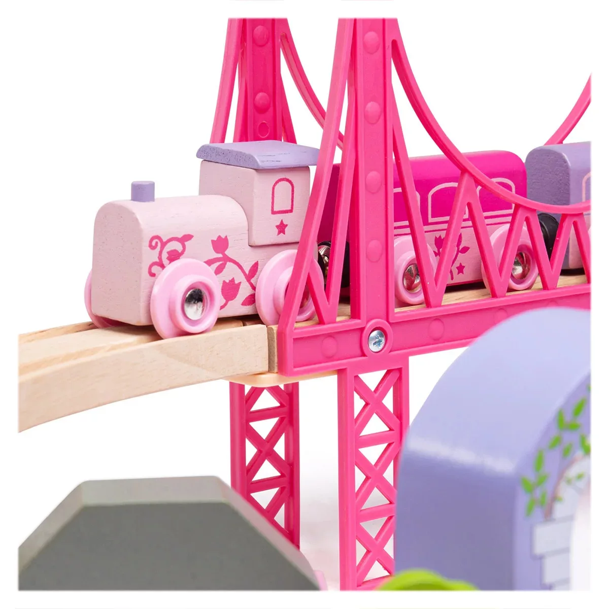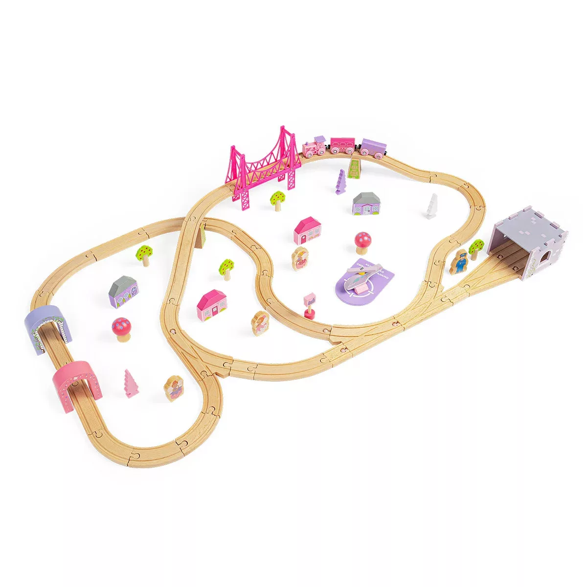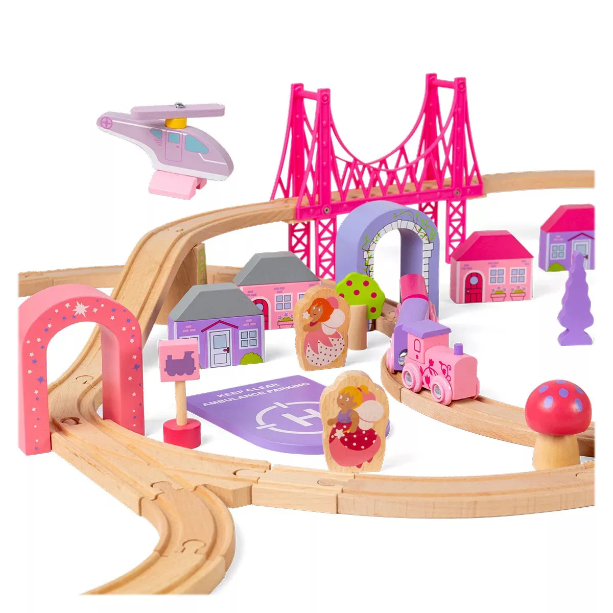Ez a tündérváros tematikájú fa vonatkészlet egy szemet gyönyörködtető, pasztell színű világba vezeti a gyerekeket. A 75 darabos szett többféle vonatsínelemet, házikót, fát, tündérfigurát és más mesevilág elemet tartalmaz, amelyek segítségével a történetek életre kelnek a gyerekszobában.