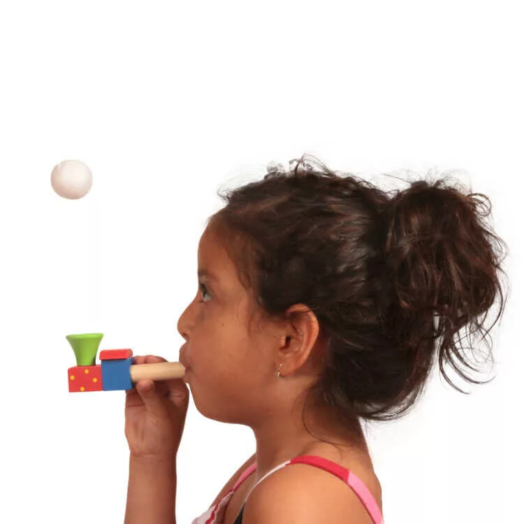 Fából és műanyagból készült ügyességi játék. A játék lényege, hogy minél erősebben fújjuk meg a labdát, hogy lebegjen. Az egész család számára örömteli perceket és könnyű kikapcsolódást nyújt. Ezen kívül kiválóan alkalmas logopédiai fejlesztésekhez.