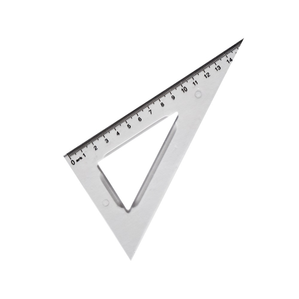 Átlátszó, víztiszta, műanyag, 90-45-45 fokos háromszög vonalzó, iskolai és irodai felhasználására.